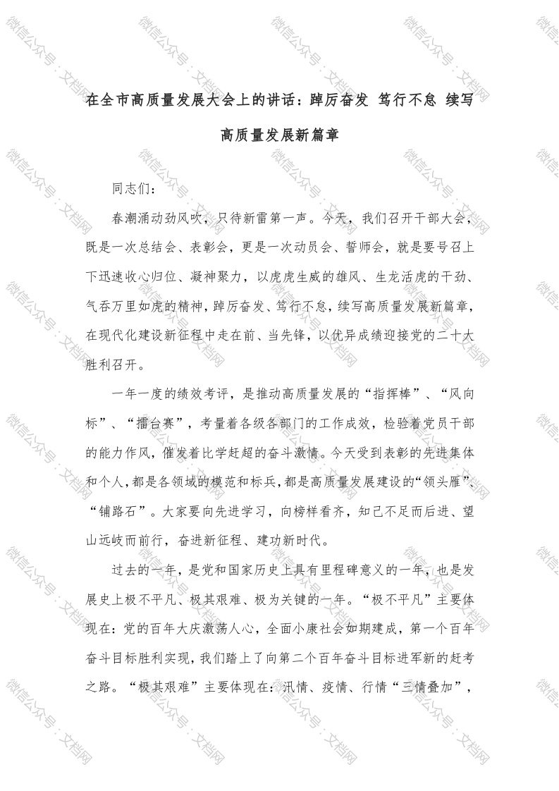 在全市高质量发展大会上的讲话:踔厉奋发 笃行不怠 续写高质量发展新篇章