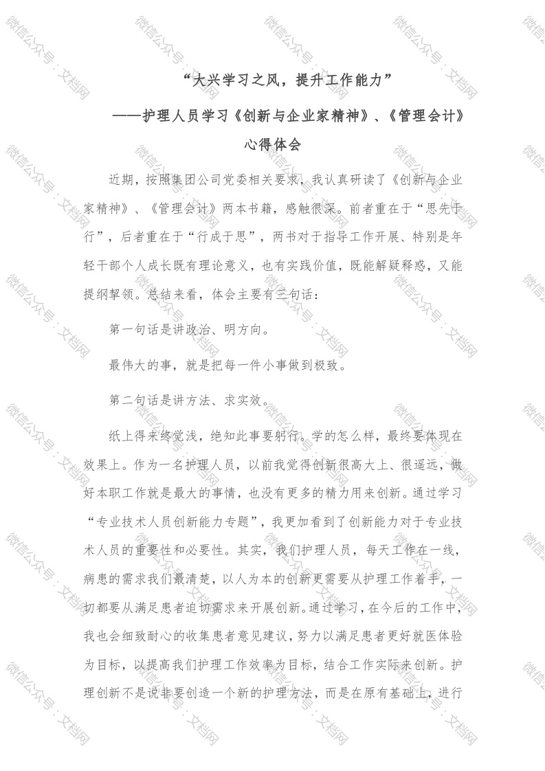 护理人员​学习《创新与企业家精神》、《管理会计》​心得体会“大兴学习之风,提升工作能力”