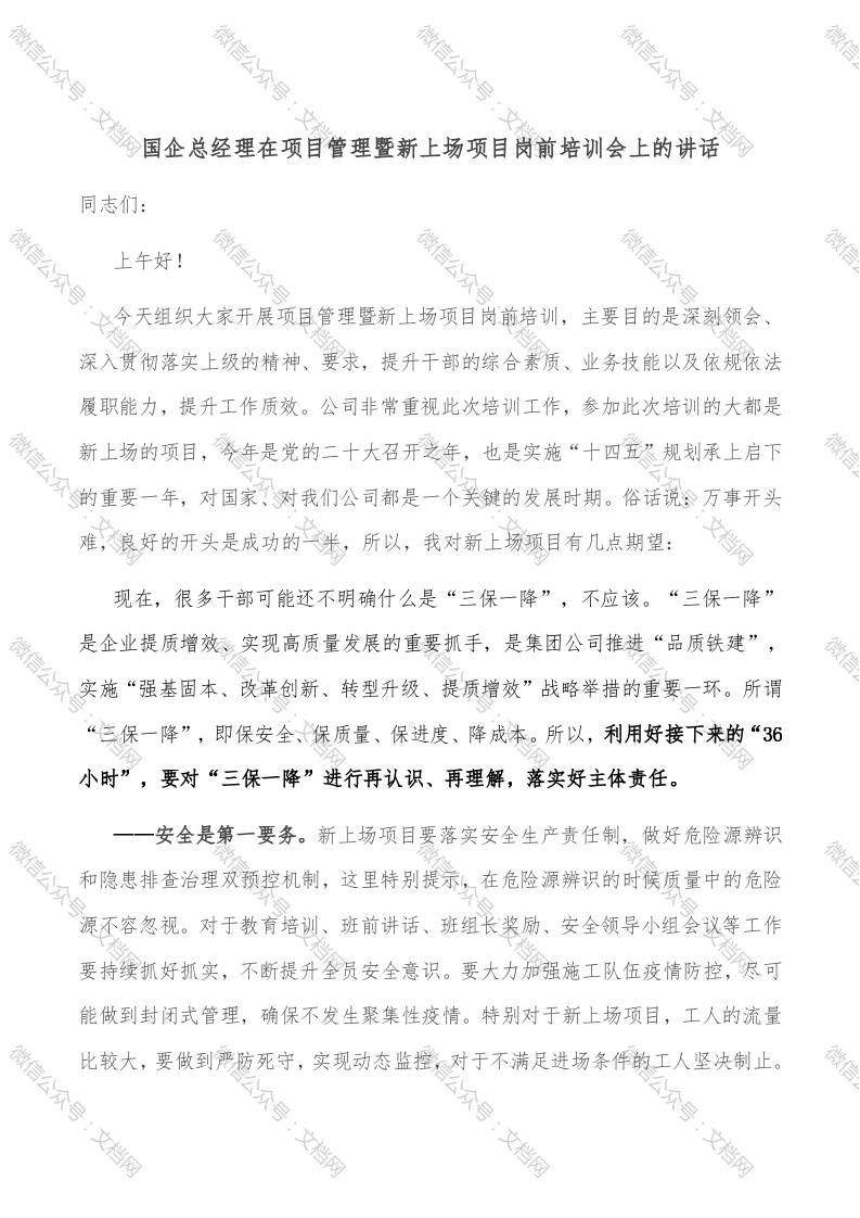 国企总经理在项目管理暨新上场项目岗前培训会上的讲话
