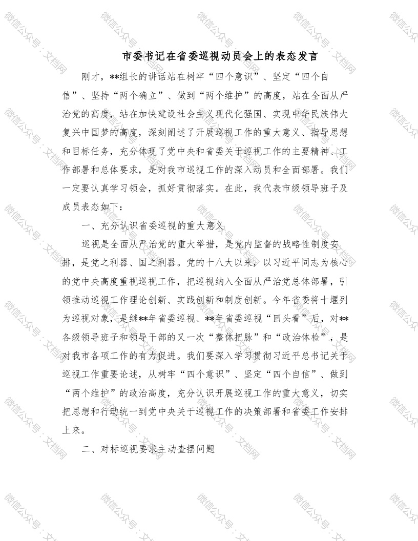 首页精选范文市委书记在省委巡视动员会上的表态发言