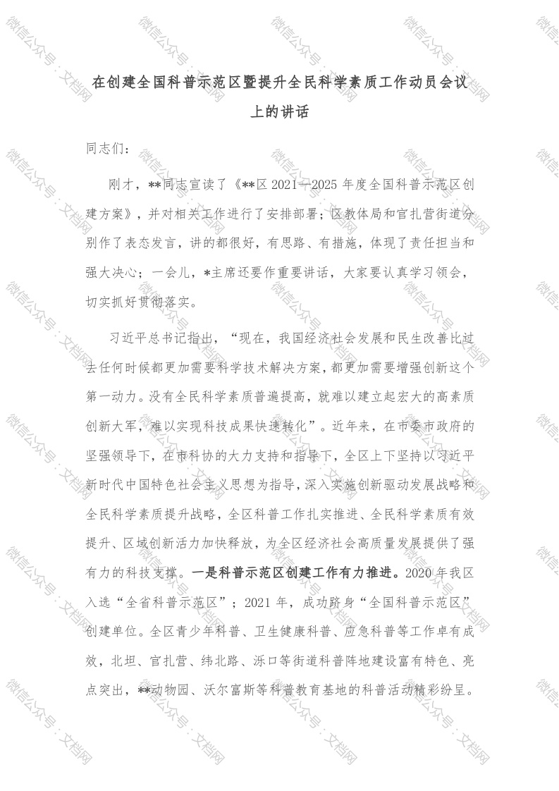首页讲课讲稿在创建全国科普示范区暨提升全民科学素质工作动员会议上的讲话