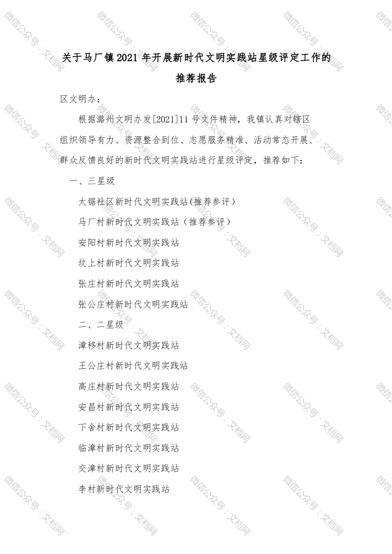 关于马厂镇2021年开展新时代文明实践站星级评定工作的推荐报告