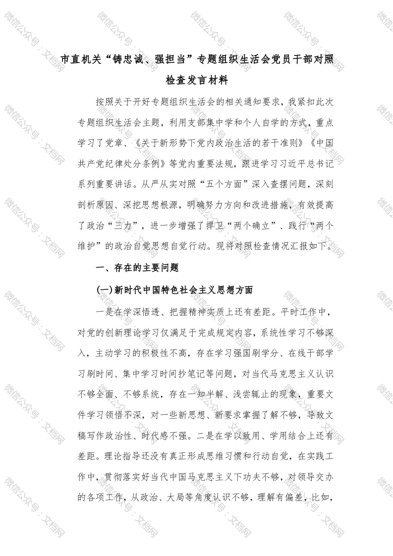 首页精选范文市直机关“铸忠诚、强担当”专题组织生活会党员干部对照检查发言材料