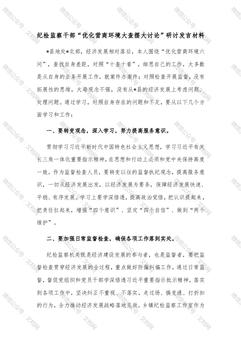 纪检监察干部“优化营商环境大查摆大讨论”研讨发言材料