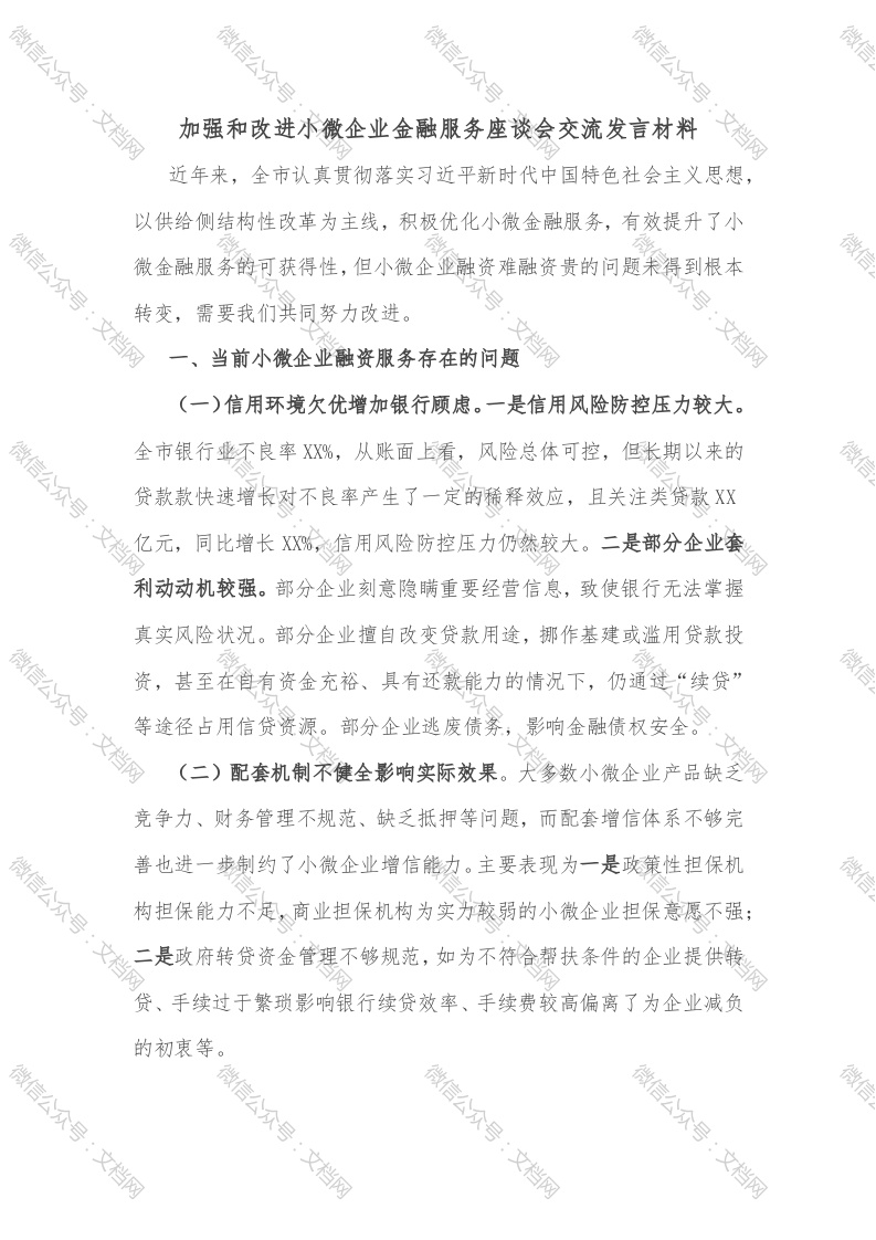 加强和改进小微企业金融服务座谈会交流发言材料