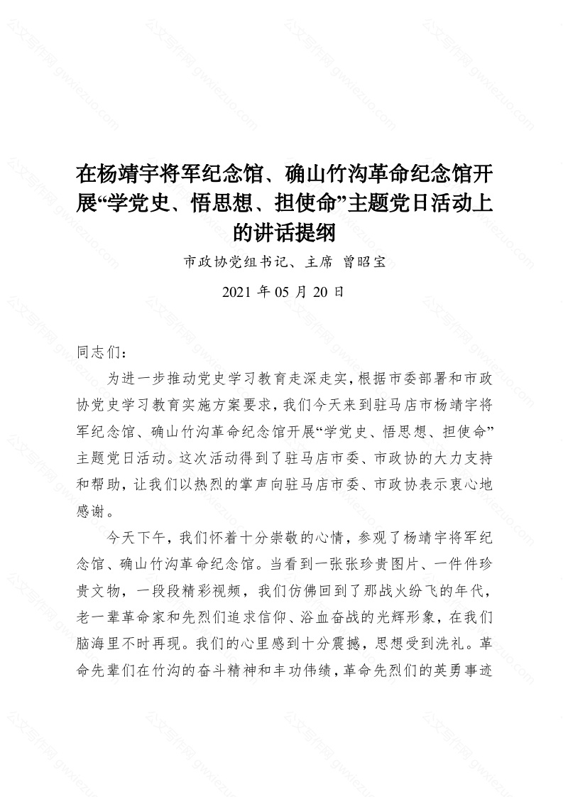 在杨靖宇将军纪念馆、确山竹沟革命纪念馆开展“学党史、悟思想、担使命”主题党日活动上的讲话提纲