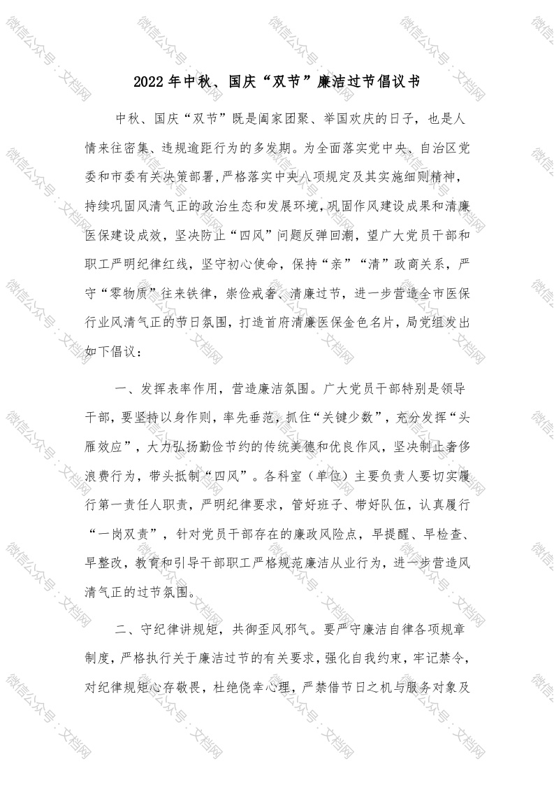 2022年中秋、国庆“双节”廉洁过节倡议书