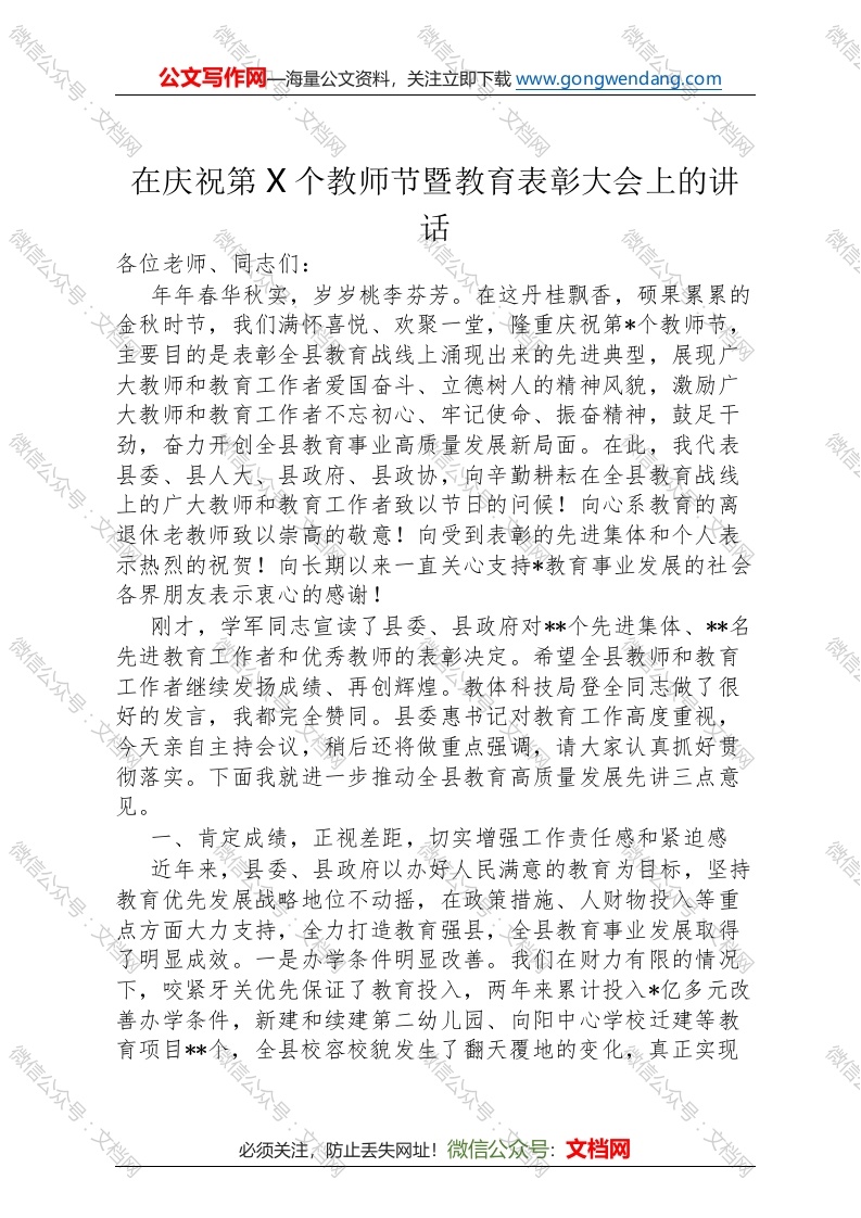 在庆祝第X个教师节暨教育表彰大会上的讲话