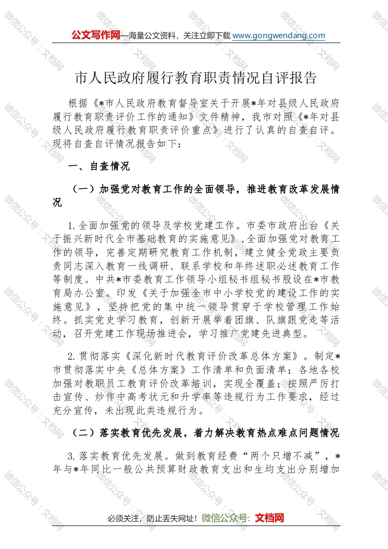 首页精选范文市人民政府履行教育职责情况自评报告