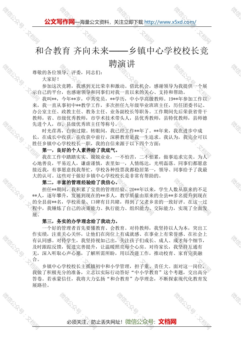 和合教育 齐向未来——乡镇中心学校校长竞聘演讲