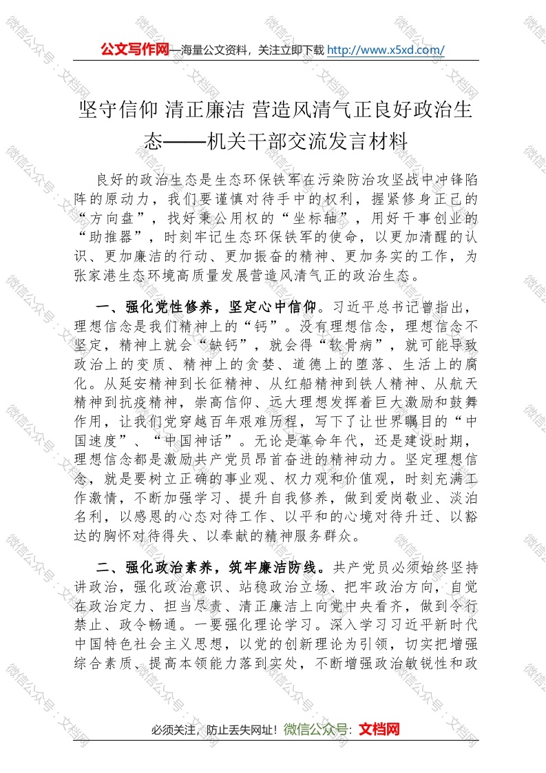 坚守信仰 清正廉洁 营造风清气正良好政治生态——机关干部交流发言材料