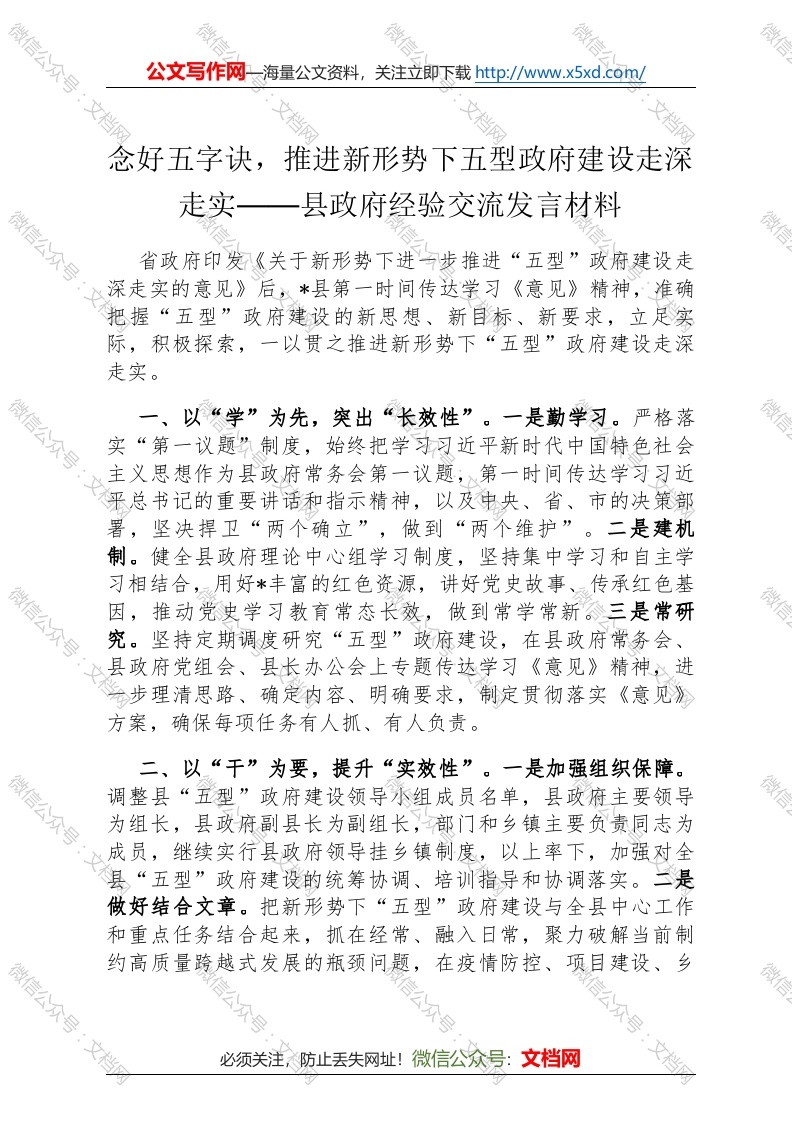 念好五字诀,推进新形势下五型政府建设走深走实——县政府经验交流发言材料