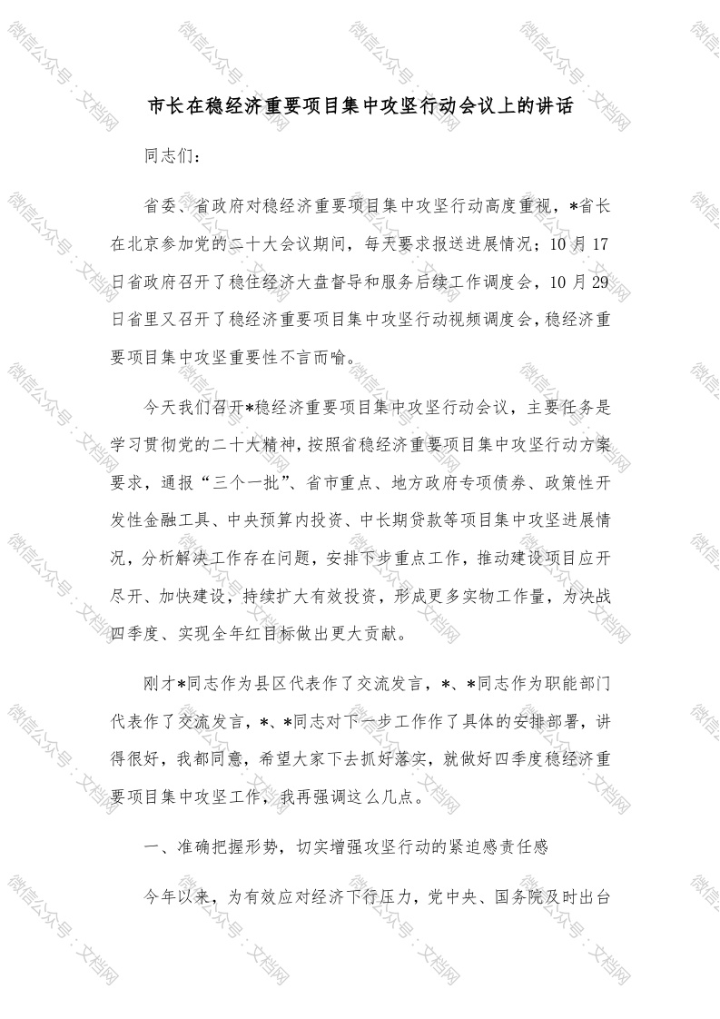 市长在稳经济重要项目集中攻坚行动会议上的讲话