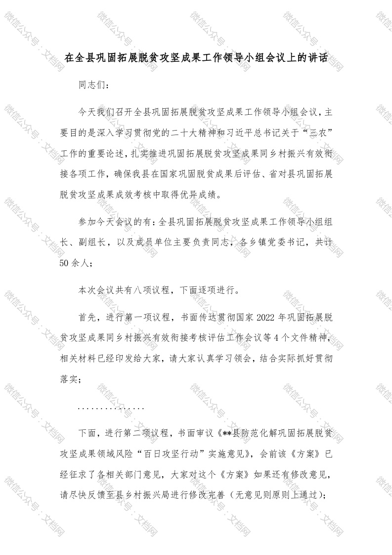 在全县巩固拓展脱贫攻坚成果工作领导小组会议上的讲话