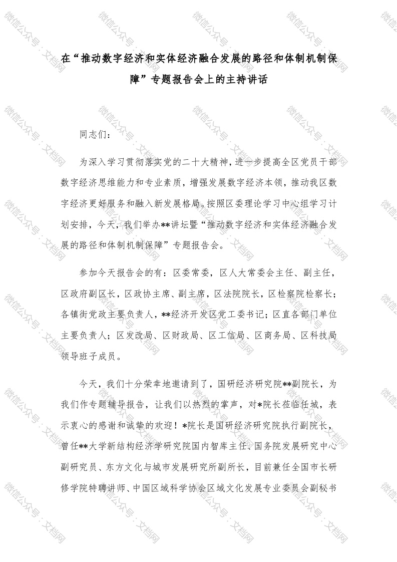 在“推动数字经济和实体经济融合发展的路径和体制机制保障”专题报告会上的主持讲话