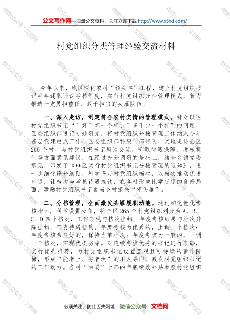 村党组织分类管理经验交流材料