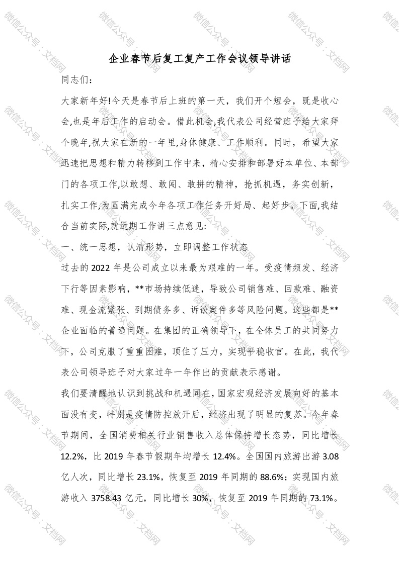 首页讲课讲稿企业春节后复工复产工作会议领导讲话