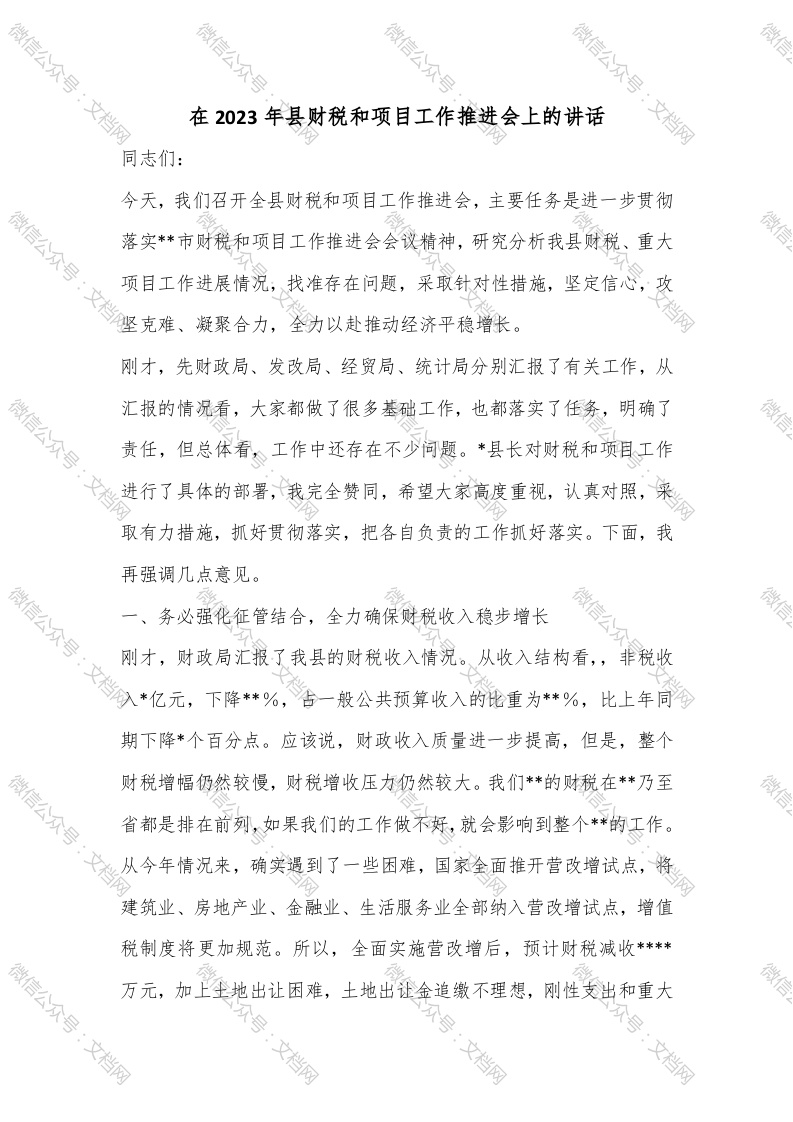 首页讲课讲稿在2023年县财税和项目工作推进会上的讲话