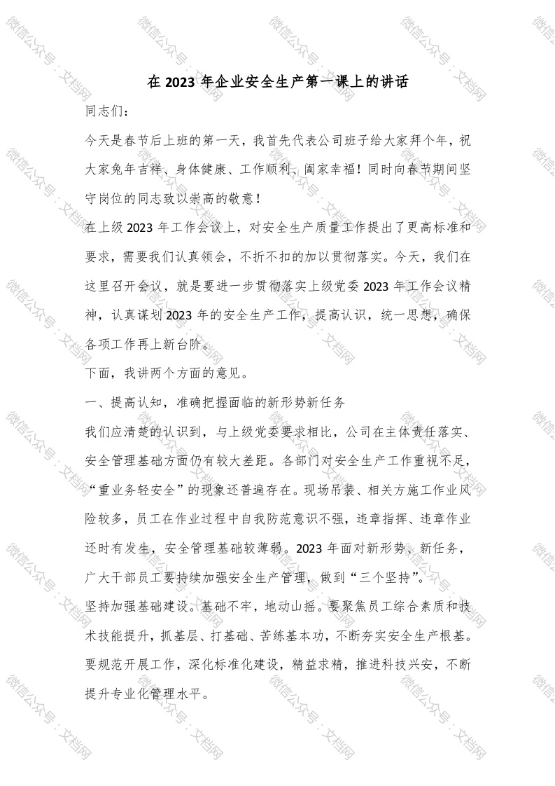 首页讲课讲稿在2023年企业安全生产第一课上的讲话
