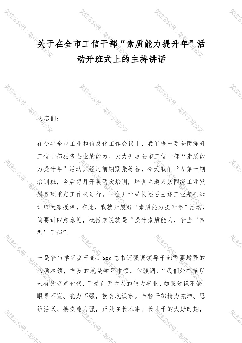 关于在全市工信干部“素质能力提升年”活动开班式上的主持讲话