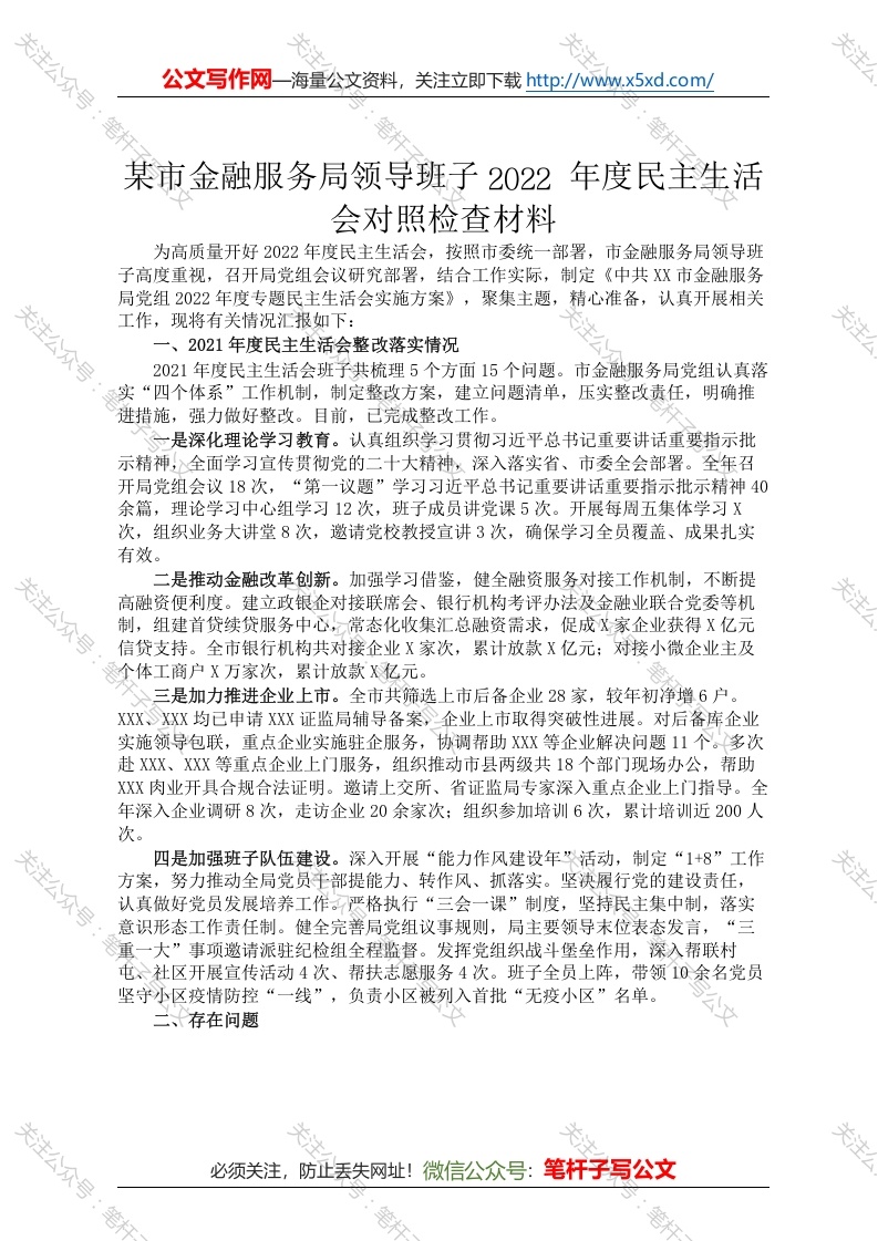 首页材料汇编某市金融服务局领导班子2022年度民主生活会对照检查材料