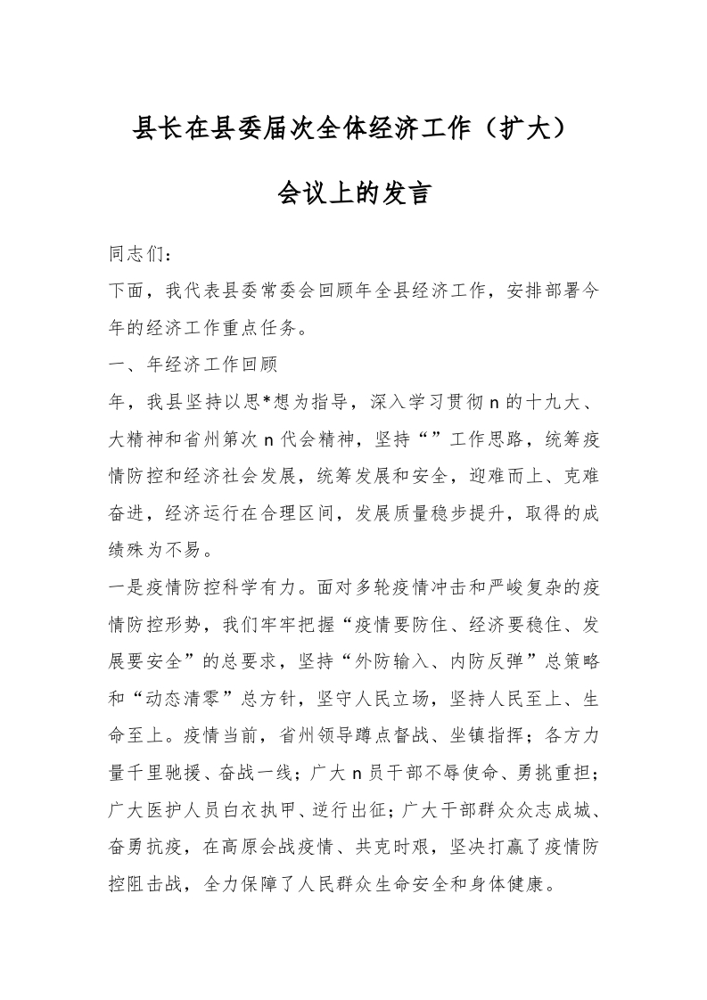 县长在县委届次全体经济工作(扩大)会议上的发言同志们:下面,我代表县委常委会回顾年全县经济工作,安排部署今年的经济工作重点任务。一、年经济工作回顾年,我县坚持以思*想为指导,深入学习贯彻的十九大、大精神和省州第次n代会精神,坚持“”工作思路,统筹疫情防控和经济社会发展,统筹发展和安全,迎难而上、克难奋进,经济运行在合理区间,发展质量稳步提升,取得的成绩殊为不易。一是疫情防控科学有力。面对多轮疫情冲击和严峻复杂的疫情防控形势,我们牢牢把握“疫情要防住、经济要稳住、发展要安全”的总要求,坚持“外防输入、内防反弹”总策略和“动态清零”总方针,坚守人民立场,坚持人民至上、生命至上。疫情当前,省州领导蹲点督战、坐镇指挥;各方力量千里驰援、奋战一线;广大n员干部不辱使命、勇挑重担:广大医护人员白衣执甲、逆行出征;广大干部群众众志成城、奋勇抗疫,在高原会战疫情、共克时艰,坚决打赢了疫情防控阻击战,全力保障了人民群众生命安全和身体健康。