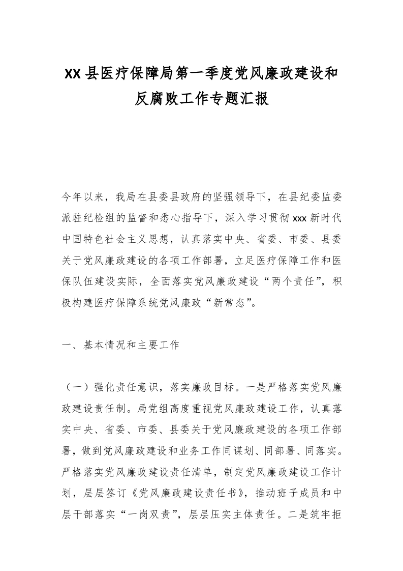 XX县医疗保障局第一季度党风廉政建设和反腐败工作专题汇报今年以来,我局在县委县政府的坚强领导下,在县纪委监委派驻纪检组的监督和悉心指导下,深入学习贯彻xx新时代中国特色社会主义思想,认真落实中央、省委、市委、县委关于党风廉政建设的各项工作部署,立足医疗保障工作和医保队伍建设实际,全面落实党风廉政建设“两个责任”,积极构建医疗保障系统党风廉政“新常态”。一、基本情况和主要工作(一)强化责任意识,落实廉政目标。一是严格落实党风廉政建设责任制。局党组高度重视党风廉政建设工作,认真落实中央、省委、市委、县委关于党风廉政建设的各项工作部署,做到党风廉政建设和业务工作同谋划、同部署、同落实。严格落实党风廉政建设责任清单,制定党风廉政建设工作计划,层层签订《党风廉政建设责任书》,推动班子成员和中层干部落实“一岗双责”,层层压实主体责任。二是筑牢拒