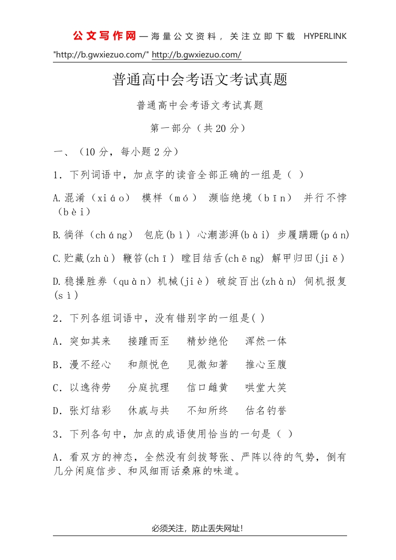 公文写作网一海量公文资料,关注立即下载HYPERLINK"http://b.gwxiezuo.com/"http://b.gwxiezuo.com/普通高中会考语文考试真题普通高中会考语文考试真题第一部分(共20分)一、(10分,每小题2分)1.下列词语中,加点字的读音全部正确的一组是()A.混淆(xiáo)模样(m6)濒临绝境(bin)并行不悖(bèi)B.徜徉(cháng)包庇(bi)心潮澎湃(bài)步履蹒跚(pán)C.贮藏(zhù)鞭答(chi)瞠目结舌(chēng)解甲归田(jiě)D.稳操胜券(quàn)机械(jiè)破绽百出(zhàn)伺机报复2.下列各组词语中,没有错别字的一组是()A.突如其来接踵而至精妙绝伦浑然一体B.漫不经心和颜悦色见微知著推心至腹C.以逸待劳分庭抗理信口雌黄哄堂大笑D.张灯结彩休戚与共不知所终估名钓誉3.下列各句中,加点的成语使用恰当的一句是()A.看双方的神态,全然没有剑拔弩张、严阵以待的气势,倒有几分闲庭信步、和风细雨话桑麻的味道。必须关注,防止丢失网址!