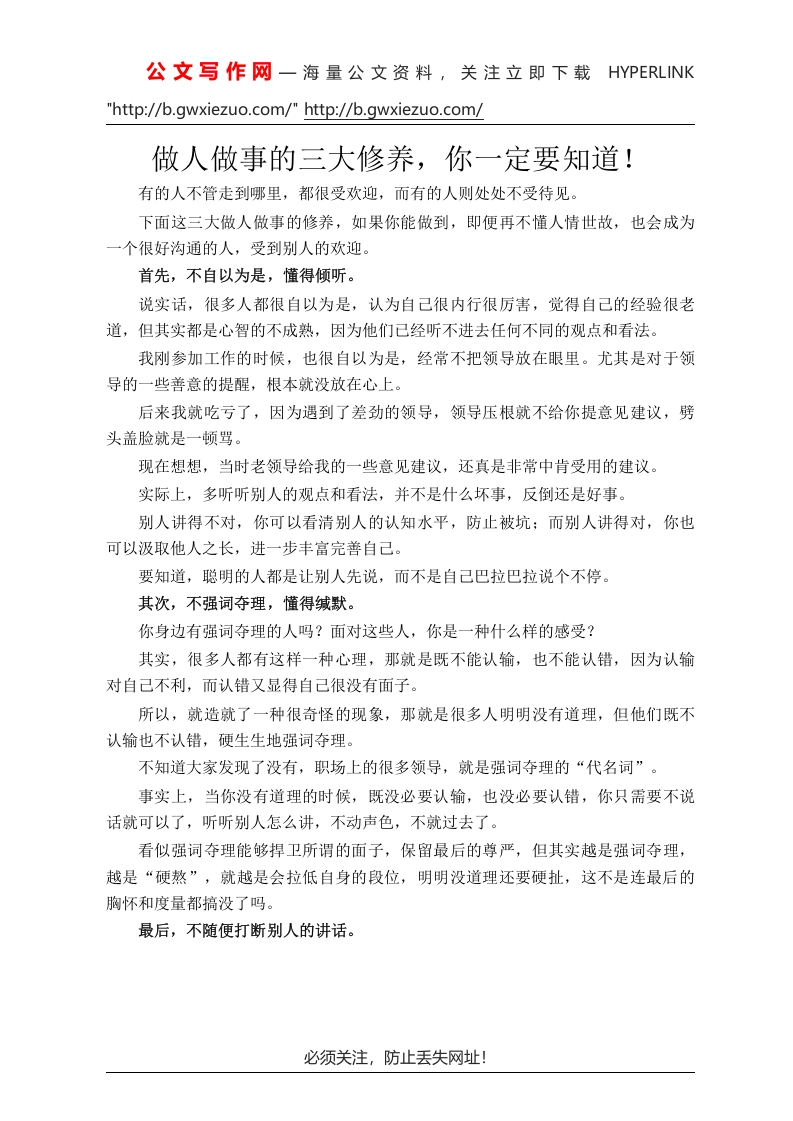 公文写作网一海量公文资料,关注立即下载HYPERLINK"http://b.gwxiezuo.com/"http://b.gwxiezuo.com/做人做事的三大修养,你一定要知道!有的人不管走到哪里,都很受欢迎,而有的人则处处不受待见。下面这三大做人做事的修养,如果你能做到,即便再不懂人情世故,也会成为一个很好沟通的人,受到别人的欢迎。首先,不自以为是,懂得倾听。说实话,很多人都很自以为是,认为自己很内行很厉害,觉得自己的经验很老道,但其实都是心智的不成熟,因为他们已经听不进去任何不同的观点和看法。我刚参加工作的时候,也很自以为是,经常不把领导放在眼里。尤其是对于领导的一些善意的提醒,根本就没放在心上。后来我就吃亏了,因为遇到了差劲的领导,领导压根就不给你提意见建议,劈头盖脸就是一顿骂。现在想想,当时老领导给我的一些意见建议,还真是非常中肯受用的建议。实际上,多听听别人的观点和看法,并不是什么坏事,反倒还是好事。别人讲得不对,你可以看清别人的认知水平,防止被坑:而别人讲得对,你也可以汲取他人之长,进一步丰富完善自己。要知道,聪明的人都是让别人先说,而不是自己巴拉巴拉说个不停。其次,不强词夺理,懂得缄默。你身边有强词夺理的人吗?面对这些人,你是一种什么样的感受?其实,很多人都有这样一种心理,那就是既不能认输,也不能认错,因为认输对自己不利,而认错又显得自己很没有面子。所以,就造就了一种很奇怪的现象,那就是很多人明明没有道理,但他们既不认输也不认错,硬生生地强词夺理。不知道大家发现了没有,职场上的很多领导,就是强词夺理的“代名词”。事实上,当你没有道理的时候,既没必要认输,也没必要认错,你只需要不说话就可以了,听听别人怎么讲,不动声色,不就过去了。看似强词夺理能够捍卫所谓的面子,保留最后的尊严,但其实越是强词夺理,越是“硬熬”,就越是会拉低自身的段位,明明没道理还要硬扯,这不是连最后的胸怀和度量都搞没了吗。最后,不随便打断别人的讲话。必须关注,防止丢失网址!