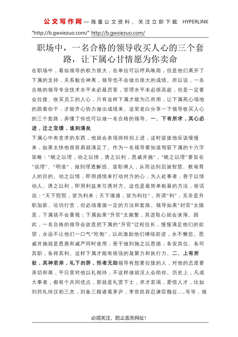 公文写作网一海量公文资料,关注立即下载HYPERLINK"http://b.gwxiezuo.com/"http://b.gwxiezuo.com/职场中,一名合格的领导收买人心的三个套路,让下属心甘情愿为你卖命在职场中,看似领导的权力很大,在单位可以呼风唤雨,但是他们离开了下属的支持,关系貌合神离,领导也不会做出很大的成绩。所以说,一名合格的领导专业技术水平未必最厉害,管理水平未必很高超,但是一定要会拉拢、收买员工的人心,只有这样下属才能为己所用,让下属死心塌地的跟着你干,才能齐心协力做出成绩来。这里老白分享一下领导收买人心的三个套路,弄懂了你也可以做一名合格的领导。一、下有所求,其心必进,迁之宜缓,速则满矣下属心中有贪求的东西,他就会表现得特别上进,这时提拔他应该慢慢来,如果太快他很容易就满足了。作为一名领导要知道驾驭下属的十六字策略:“晓之以理,动之以情,诱之以利,恩威并施”,“晓之以理”要旨在“说理”、“明道”,做到理透解惑、道彰傅人,从而达到启迪智慧、教海育人的目的。动之以情,即用感情来打动对方的心,为人处事者,善于以情动人。诱之以利,即用利益来引诱对方。这也是最简单粗暴的方法,俗话说:“天下熙熙,皆为利来;天下攘攘,皆为利往”,所谓“利”,无非是升职加薪、论功行赏,但必须遵循一定的方法和套路。领导如果“封官”太随意,下属就不会重视;下属如果“升官”太频繁,其进取心就会淡薄。因此,一名合格的领导会故意把下属的“升官”过程拉长,慢慢满足他们的欲望,永远不让他们一口气“吃饱”,以此激励他们继续前进,永不懈怠。恩威并施就是恩惠和威严同时使用,善于做到施之以恩德,各安其位、各司其职,各得其利。这样下属才能有很强的凝聚力和执行力。二、上有所欲,其神若亲,礼下勿辞,拒者无助领导有想要拉拢的人,对他的态度要亲切和蔼,平日里对他以礼相待,不这样做就没人会助你。历史上,凡成大事者,都有个共同优点,那就是礼贤下士,求才若渴,爱惜人才,比如刘邦礼待汉初三杰,刘备三顾诸葛茅庐,李世民容忍谏臣魏征……等等,领必须关注,防止丢失网址!