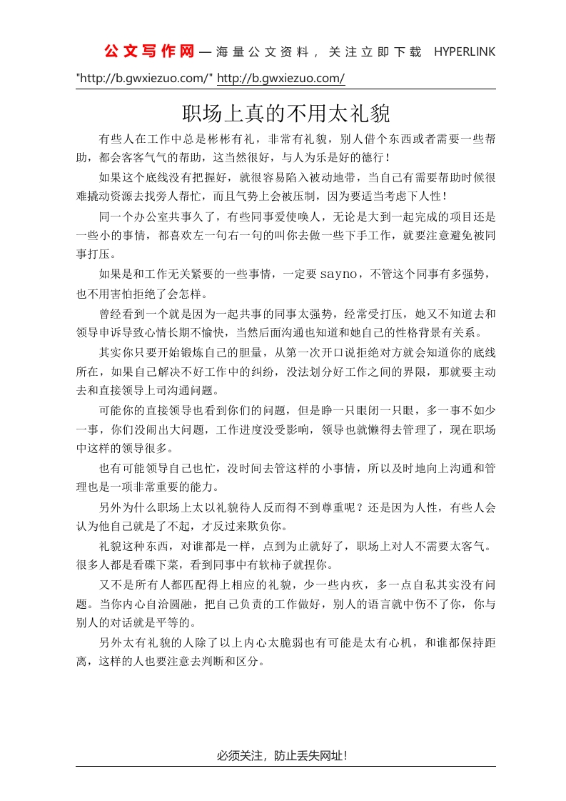 公文写作网一海量公文资料,关注立即下载HYPERLINK"http://b.gwxiezuo.com/"http://b.gwxiezuo.com/职场上真的不用太礼貌有些人在工作中总是彬彬有礼,非常有礼貌,别人借个东西或者需要一些帮助,都会客客气气的帮助,这当然很好,与人为乐是好的德行!如果这个底线没有把握好,就很容易陷入被动地带,当自己有需要帮助时候很难撬动资源去找旁人帮忙,而且气势上会被压制,因为要适当考虑下人性!同一个办公室共事久了,有些同事爱使唤人,无论是大到一起完成的项目还是一些小的事情,都喜欢左一句右一句的叫你去做一些下手工作,就要注意避免被同事打压。如果是和工作无关紧要的一些事情,一定要Sayn0,不管这个同事有多强势,也不用害怕拒绝了会怎样。曾经看到一个就是因为一起共事的同事太强势,经常受打压,她又不知道去和领导申诉导致心情长期不愉快,当然后面沟通也知道和她自己的性格背景有关系。其实你只要开始锻炼自己的胆量,从第一次开口说拒绝对方就会知道你的底线所在,如果自己解决不好工作中的纠纷,没法划分好工作之间的界限,那就要主动去和直接领导上司沟通问题。可能你的直接领导也看到你们的问题,但是睁一只眼闭一只眼,多一事不如少一事,你们没闹出大问题,工作进度没受影响,领导也就懒得去管理了,现在职场中这样的领导很多。也有可能领导自己也忙,没时间去管这样的小事情,所以及时地向上沟通和管理也是一项非常重要的能力。另外为什么职场上太以礼貌待人反而得不到尊重呢?还是因为人性,有些人会认为他自己就是了不起,才反过来欺负你。礼貌这种东西,对谁都是一样,点到为止就好了,职场上对人不需要太客气。很多人都是看碟下菜,看到同事中有软柿子就捏你。又不是所有人都匹配得上相应的礼貌,少一些内疚,多一点自私其实没有问题。当你内心自洽圆融,把自己负责的工作做好,别人的语言就中伤不了你,你与别人的对话就是平等的。另外太有礼貌的人除了以上内心太脆弱也有可能是太有心机,和谁都保持距离,这样的人也要注意去判断和区分。必须关注,防止丢失网址!