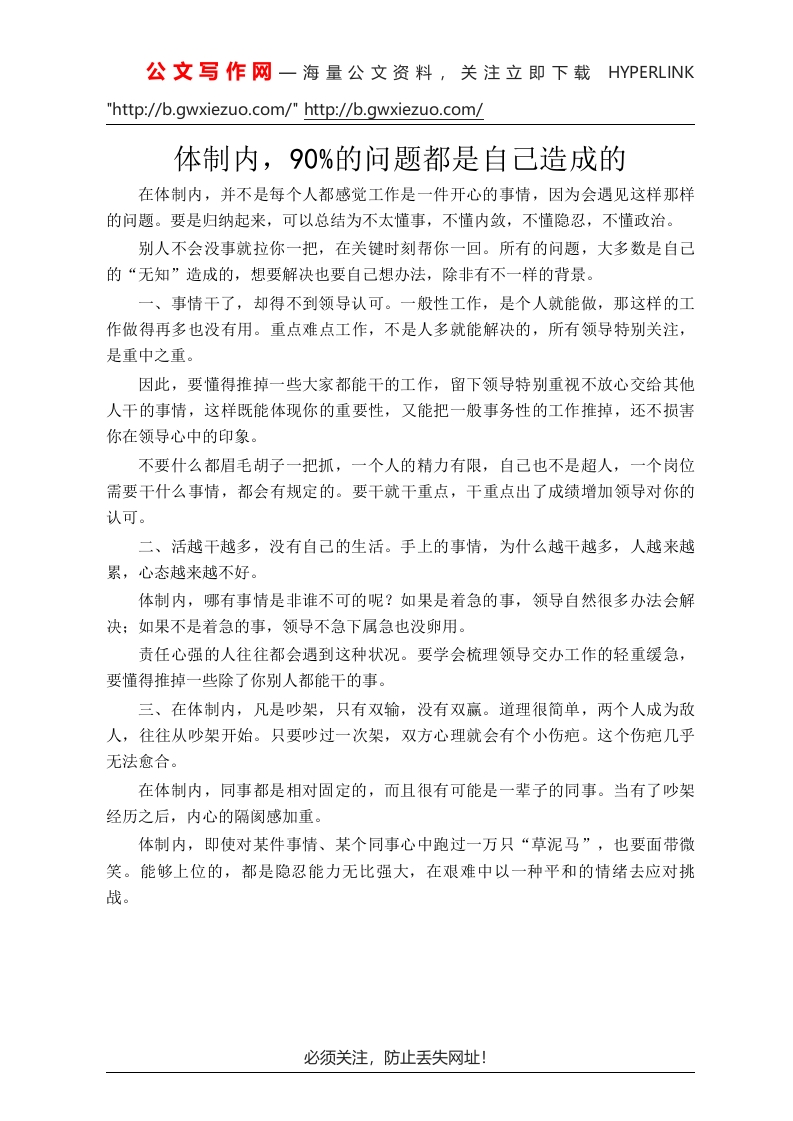 公文写作网一海量公文资料,关注立即下载HYPERLINK"http://b.gwxiezuo.com/"http://b.gwxiezuo.com/体制内,90%的问题都是自己造成的在体制内,并不是每个人都感觉工作是一件开心的事情,因为会遇见这样那样的问题。要是归纳起来,可以总结为不太懂事,不懂内敛,不懂隐忍,不懂政治。别人不会没事就拉你一把,在关键时刻帮你一回。所有的问题,大多数是自己的“无知”造成的,想要解决也要自己想办法,除非有不一样的背景。一、事情干了,却得不到领导认可。一般性工作,是个人就能做,那这样的工作做得再多也没有用。重点难点工作,不是人多就能解决的,所有领导特别关注,是重中之重。因此,要懂得推掉一些大家都能干的工作,留下领导特别重视不放心交给其他人干的事情,这样既能体现你的重要性,又能把一般事务性的工作推掉,还不损害你在领导心中的印象。不要什么都眉毛胡子一把抓,一个人的精力有限,自己也不是超人,一个岗位需要干什么事情,都会有规定的。要干就干重点,干重点出了成绩增加领导对你的认可。二、活越干越多,没有自己的生活。手上的事情,为什么越干越多,人越来越累,心态越来越不好。体制内,哪有事情是非谁不可的呢?如果是着急的事,领导自然很多办法会解决:如果不是着急的事,领导不急下属急也没卵用。责任心强的人往往都会遇到这种状况。要学会梳理领导交办工作的轻重缓急,要懂得推掉一些除了你别人都能干的事。三、在体制内,凡是吵架,只有双输,没有双赢。道理很简单,两个人成为敌人,往往从吵架开始。只要吵过一次架,双方心理就会有个小伤疤。这个伤疤几乎无法愈合。在体制内,同事都是相对固定的,而且很有可能是一辈子的同事。当有了吵架经历之后,内心的隔阂感加重。体制内,即使对某件事情、某个同事心中跑过一万只“草泥马”,也要面带微笑。能够上位的,都是隐忍能力无比强大,在艰难中以一种平和的情绪去应对挑战。必须关注,防止丢失网址!
