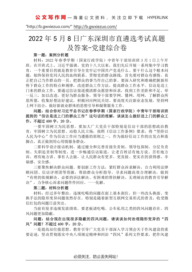 公文写作网一海量公文资料,关注立即下载HYPERLINK"http://b.gwxiezuo.com/"http://b.gwxiezuo.com/2022年5月8日广东深圳市直遴选考试真题及答案-党建综合卷第一题:案例分析题材料:2022年春季学期(国家行政学院)中青年干部培训班3月1日上午开班。在开班式上,习近平强调,党的十八大以来,我们先后开展一系列集中学习教育,一个重要目的就是教育引导全党牢记中国共产党是什么、要干什么这个根本问题,始终保持党同人民的血肉联系。贯彻党的群众路线,首先要对群众有感情,真正把自己当作群众的一员、把群众的事当作自己的事。要深入研究和准确把握新形势下群众工作的特点和规律,改进群众工作方法,提高群众工作水平。信访是送上门来的群众工作,要通过信访渠道摸清群众愿望和诉求,找到工作差距和不足,举一反三,加以改进,更好为群众服务。领导干部要学网、懂网、用网,了解群众所思所愿,收集好想法好建议,积极回应网民关切。要高度关注新业态发展,坚持网上网下结合,做好新就业群体的思想引导和凝聚服务工作。问题:结合你对习近平总书记在春季学期(国家行政学院)中青年干部培训班提到的“信访是送上门的群众工作”这句话的理解,谈谈怎么做好送上门的群众工作。不超过400字,20分。一要牢固树立为民思想。要加大广大党员干部特别是信访干部的思想政治教育,牢固树立为民思想、站稳人民立场,按照《信访工作条例》要求,将“坚持以人民为中心”作为信访工作应当遵循的原则之一,作为做好信访工作的出发点和落脚点,真正做到用心用情服务群众。二要科学设计接访机制。通过健全和完善首接负责制。领导包保制、分层负责制、失职追责制等制度,进一步畅通信访渠道,让老百姓话有地方说、苦有地方诉、理有地方讲、事有人去做,让人民群众有更多、更直接、更实在的获得感、幸福感、安全感。三要聚焦解决群众问题。要创新工作方法,紧盯群众诉求解决,合力利用法律顾问团、信访评理团等资源,帮助群众分析指导,寻求问题高效合理解决,做到“有理的依规解决、必要的诉法解决、有困难的帮扶解决、无理闹访的教育引导解决”,力争核心诉求问题件件回应、一一化解。第二题:材料分析题材料:经过多年整治,违规吃喝的问题在面上基本刹住,但一些改头换面、变换手法的隐形变异问题依然存在。特别是随着新型互联网交易形式的普及,收受微信红包的问题日益突出。当前有很多违规发放绩效、要老板请吃喝、公车私用之类的四风问题存在。四风问题更加隐蔽。问题:结合现在出现很多隐蔽的四风问题,请谈谈如何治理隐形变异的“四风”问题?不超过400字,20分。一是提高站位强思想。教育引导广大党员干部深入学习领会关于作风建设的重要论述,坚决贯彻落实中央八项规定精神和纠治“四风”系列文件要求,把作风建必须关注,防止丢失网址!