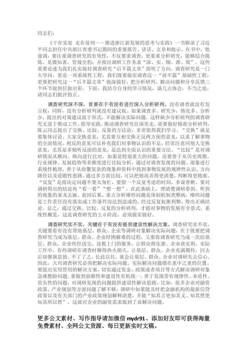 同志们:《干在实处走在前列一一推进浙江新发展的思考与实践》一书辑录了习近平同志担任中共浙江省委书记期间的重要报告、讲话、文章和批示。在书中,他强调,要注重调查研究的有效性,不仅要重调查,更要重分析研究,能够综合提炼、见微知著、管窥全豹:并指出调研工作务求“深、实、细、准、效”。这些重要论述为我们扎实做好调查研究“后半篇文章”指明了方向。调查研究是一门大学问,更是一项系统性工程,我们既要做实调查这一“前半篇”基础性工程,更要把研究这一“后半篇文章”做深做好,把分析研判、解决问题和分享反馈三个环节做到位做出彩。下面,我结合自身的学习情况,谈几点体会,不当之处,请同志们批评指正。调查研究深不深,首要在于有没有进行深入分析研判。没有调查就没有发言权,同样,没有分析研判就没有建议权。如果调查多、研究少,情况多、分析少,提出的对策建议流于形式,不能解决实际问题,这样缺少分析研判的调查研究无益于推动工作、指导实践。推动调查研究往深里走,需要做好精准分析研判,陈云同志提出了交换、比较、反复的方法论,非常值得我们学习。“交换”就是要集体讨论、大家交换意见,尤其要互相交换正反两方面的意见,以求了解事物的全面情况。相反的意见可以补充我们对事物认识的不足,经常注意同别人交换意见,尤其是多倾听反面的意见,是达到全面认识的重要方法。“比较”是对调研情况从横向、纵向进行比对,如果是特别重大的问题,还要善于从历史周期、行业规律、发展趋势等多维度进行比较分析,通过对调查发现的问题、现象进行系统性梳理,善于从纷繁复杂的现象和资料中找到事物发展的规律性认识、方向路径以及前瞻性思路。通过多方面比较,可以把情况弄得更清楚,判断得更精准。“反复”是指决定问题不要太匆忙,要留一个反复考虑的时间,多谋善断。要对调研得出的结论再“看一看”“想一想”,在此基础上,理清楚调研看到、听到的现象的来龙去脉、前因后果,重点分析哪些问题是体制机制类弊病,哪些问题是工作责任没有落实或工作条件没达到造成的,经过反复权衡利弊,得出正确结论。总之,通过交换、比较、反复的分析研判,才能对事物的发展有全景式、系统性概览,这是调查研究的2.0阶段,必须做实做好。调查研究实不实,关键在于有没有提供建设性解决方案。调查研究实不实,关键要看有没有帮助基层、群众、企业等调研对象解决实际问题,在于既要把调查研究当成为基层、群众、企业纾困解难的过程,又要将调查研究当成一次给基层、群众、企业传经送宝、送教上门的服务,让群众得实惠、企业获实利。实际工作中,有些调研在调查时聊得热火朝天,让基层、群众、企业充满期待,回去后却偃旗息鼓、不了了之。长此以往,就会让基层、群众、企业对调研失去信心。因此,大兴调查研究必须把解决实际问题、实际解决问题摆在重中之重的位置。要提出实用管用的解决方案,切实通过资金、政策或者项目等方式解决调研对象急难愁盼问题。要做到前瞻性和建设性有机统一,善于发现带有规律性、本质性、苗头性的问题,对调研发现的问题提供建设性解决思路。比如,很多企业对融资政策、产业规划等方面问题了解不够,调研中如果能及时把金融机构的最新信贷政策以及有关部门的产业政策规划解释清楚,并能“知其言更知其义、知其然更知其所以然”,这就对企业的融资需求做到了真解决问题。更多公文素材、写作指导请加微信ydr91、添加好友即可获得海量免费素材、全网公文货源、每日更新实时文稿。