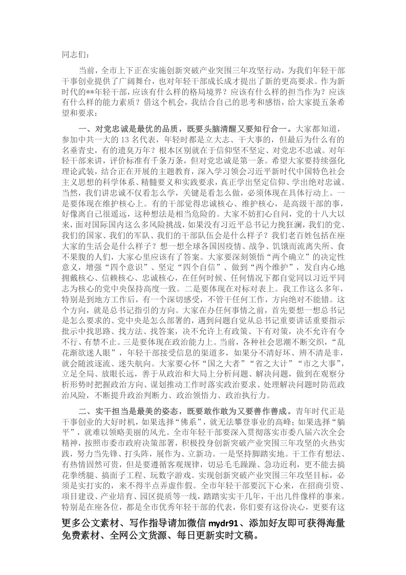 同志们:当前,全市上下正在实施创新突破产业突围三年攻坚行动,为我们年轻干部干事创业提供了广阔舞台,也对年轻干部成长成才提出了新的更高要求。作为新时代的**年轻干部,应该有什么样的格局境界?应该有什么样的担当作为?应该有什么样的能力素质?借这个机会,我结合自己的思考和感悟,给大家提五条希望和要求:一、对党忠诚是最优的品质,既要头脑清醒又要知行合一。大家都知道,参加中共一大的13名代表,年轻时都是立大志、干大事的,但最后为什么有的名垂青史,有的遗臭万年?根本区别就在于信仰坚不坚定、对党忠不忠诚。对年轻干部来讲,评价标准有千条万条,但对党忠诚是第一条。希望大家要持续强化理论武装,结合正在开展的主题教育,深入学习领会习近平新时代中国特色社会主义思想的科学体系、精髓要义和实践要求,真正学出坚定信仰、学出绝对忠诚。当然,我们讲忠诚不仅看怎么学,关键是看怎么做,必须体现在具体行动上。一是要体现在维护核心上。有的干部觉得忠诚核心、维护核心,是高级干部的事,好像离自己很遥远,这种想法是相当危险的。大家不妨扪心自问,党的十八大以来,面对国际国内这么多风险挑战,如果没有习近平总书记力挽狂澜,我们的党、我们的国家、我们的军队、我们的干部队伍会是什么样子?我们老百姓包括在座大家的生活会是什么样子?想一想全球各国因疫情、战争、饥饿而流离失所、食不果腹的人们,大家心里应该有了答案。大家要深刻领悟“两个确立”的决定性意义,增强“四个意识”、坚定“四个自信”、做到“两个维护”,发自内心地拥戴核心、信赖核心、忠诚核心,在任何时候、任何情况下都自觉同以习近平同志为核心的党中央保持高度一致。二是要体现在对标对表上。我工作这么多年,特别是到地方工作后,有一个深切感受,不管干任何工作,方向绝对不能错。这个方向,就是总书记指引的方向。大家在办任何事情之前,首先要想一想总书记是怎么要求的、党中央是怎么部署的,遇到问题自觉从总书记重要讲话重要指示批示中找思路、找方法、找答案,决不允许上有政策、下有对策,决不允许有令不行、有禁不止。三是要体现在政治能力上。当前,各种社会思潮不断交织,“乱花渐欲迷人眼”,年轻干部接受信息的渠道多,如果分不清好坏、辨不清是非,就会随波逐流、迷失航向。大家要心怀“国之大者”“省之大计”“市之大事”,立足全局、放眼长远,善于从政治和大局上分析问题、解决问题,做到在观察分析形势时把握政治方向、谋划推动工作时落实政治要求、处理解决问题时防范政治风险,不断提升政治判断力、政治领悟力、政治执行力。二、实干担当是最美的姿态,既要敢作敢为又要普作普成。青年时代正是干事创业的大好时机,如果选择“佛系”,就无法攀登事业的高峰:如果选择“躺平”,就难以领略美丽的风光。全市年轻干部要深入贯彻落实市委八届六次全会精神,按照市委市政府决策部署,积极投身创新突破产业突围三年攻坚的火热实践,努力当先锋、打头阵,展作为、立新功。一是坚持脚踏实地。干工作有想法、有热情固然可贵,但是要遵循客观规律,切忌毛毛躁躁、急功近利,更不能去搞花拳绣腿、搞面子工程、玩数字游戏。实现创新突破产业突围三年攻坚目标,必须是实打实的,来不得半点弄虚作假。全市年轻干部要沉下心来,在招商引资、项目建设、产业培育、园区提质等一线,踏踏实实干几年,干出几件像样的事来。特别是在座各位,都是全市优秀年轻干部的代表,你们要有这份决心,更要有这更多公文素材、写作指导请加微信mydr91、添加好友即可获得海量免费素材、全网公文货源、每日更新实时文稿。