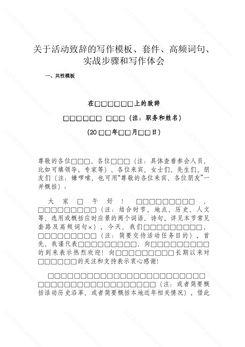 关于活动致辞的写作模板、套件、高频词句、实战步骤和写作体会
