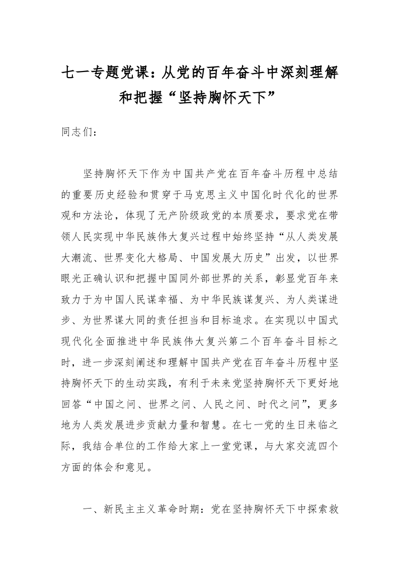 七一专题党课:从党的百年奋斗中深刻理解和把握“坚持胸怀天下”同志们:坚持胸怀天下作为中国共产党在百年奋斗历程中总结的重要历史经验和贯穿于马克思主义中国化时代化的世界观和方法论,体现了无产阶级政党的本质要求,要求党在带领人民实现中华民族伟大复兴过程中始终坚持“从人类发展大潮流、世界变化大格局、中国发展大历史”出发,以世界眼光正确认识和把握中国同外部世界的关系,彰显党百年来致力于为中国人民谋幸福、为中华民族谋复兴、为人类谋进步、为世界谋大同的责任担当和目标追求。在实现以中国式现代化全面推进中华民族伟大复兴第二个百年奋斗目标之时,进一步深刻阐述和理解中国共产党在百年奋斗历程中坚持胸怀天下的生动实践,有利于未来党坚持胸怀天下更好地回答“中国之问、世界之问、人民之问、时代之问”,更多地为人类发展进步贡献力量和智慧。在七一党的生日来临之际,我结合单位的工作给大家上一堂党课,与大家交流四个方面的体会和意见。一、新民主主义革命时期:党在坚持胸怀天下中探索救