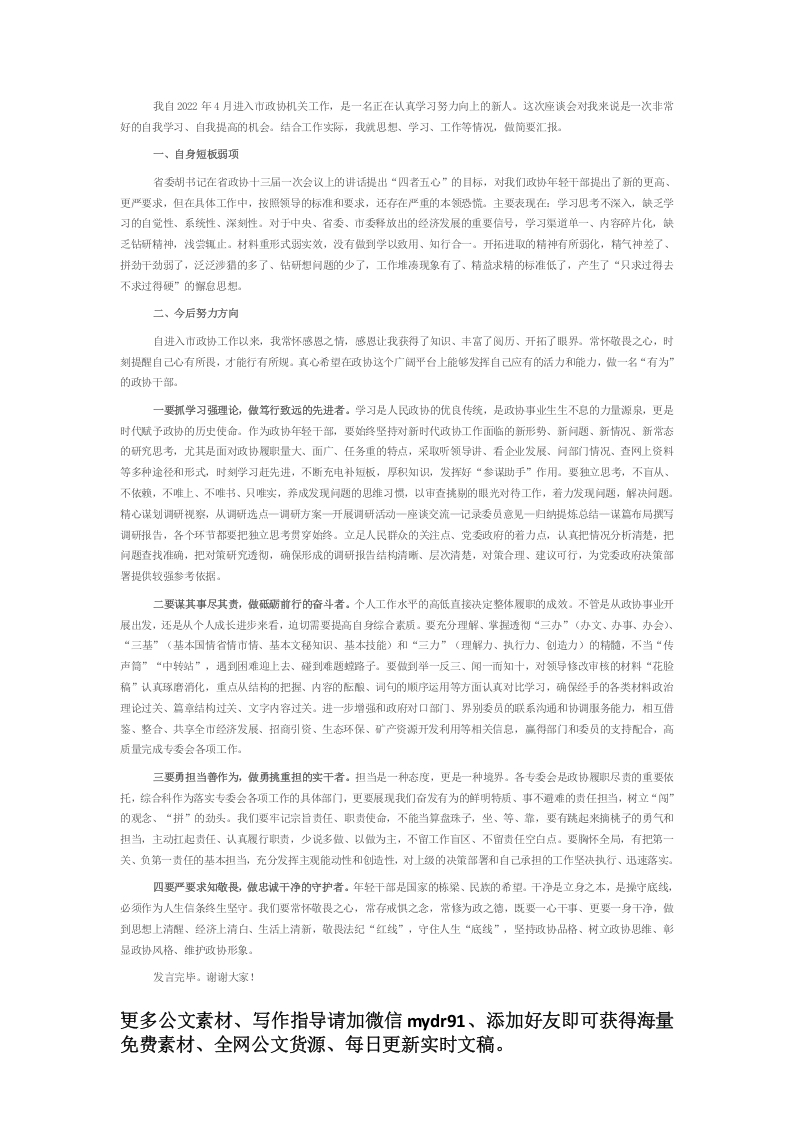 我自2022年4月进入市政协机关工作,是一名正在认真学习努力向上的新人。这次座谈会对我来说是一次非常好的自我学习、自我提高的机会。结合工作实际,我就思想、学习、工作等情况,做简要汇报。一、自身短板弱项省委胡书记在省政协十三届一次会议上的讲话提出“四者五心”的目标,对我们政协年轻干部提出了新的更高、更严要求,但在具体工作中,按照领导的标准和要求,还存在严重的本领恐慌。主要表现在:学习思考不深入,缺乏学习的自觉性、系统性、深刻性。对于中央、省委、市委释放出的经济发展的重要信号,学习渠道单一、内容碎片化,缺乏钻研精神,浅尝辄止。材料重形式弱实效,没有做到学以致用、知行合一。开拓进取的精神有所弱化,精气神差了、拼劲干劲弱了,泛泛涉猎的多了、钻研想问题的少了,工作堆凑现象有了、精益求精的标准低了,产生了“只求过得去不求过得硬”的懈总思想二、今后努方向自进入市政协工作以来,我常怀感恩之情,感恩让我获得了知识、丰富了阅历、开拓了眼界。常怀敬畏之心,时刻提醒自己心有所畏,才能行有所规。真心希望在政协这个广阔平台上能够发挥自己应有的活力和能力,做一名“有为”的政协干部。一要抓学习强理论,做笃行致远的先进者。学习是人民政协的优良传统,是政协事业生生不息的力量源泉,更是时代赋予政协的历史使命。作为政协年轻干部,要始终坚持对新时代政协工作面临的新形势、新问题、新情况、新常态的研究思考,尤其是面对政协履职量大、面广、任务重的特点,采取听领导讲、看企业发展、问部门情况、查网上资料等多种途径和形式,时刻学习赶先进,不断充电补短板,厚积知识,发挥好“参谋助手”作用。要独立思考,不盲从、不依赖,不唯上、不唯书、只唯实,养成发现问题的思维习惯,以审查挑剔的眼光对待工作,着力发现问题,解决题。精心谋划调研视察,从调研选点一调研方案一开展调研活动一座谈交流一记录委员意见一归钠提炼总结一谋篇布局撰写调研报告,各个环节都要把独立思考贯穿始终。立足人民群众的关注点、党委政府的着力点,认真把情况分析清楚,把问题查找准确,把对策研究透彻,确保形成的调研报告结构清晰、层次清楚,对策合理、建议可行,为党委政府决策部署提供较强参考依据。二要谋其事尽其责,做砥颡前行的奋斗者。个人工作水平的高低直接决定整体履职的成效。不管是从政协事业开展出发,还是从个人成长进步来看,迫切需要提高自身综合素质。要充分理解、掌握透彻“三办”(办文、办事、办会)、“三基”(基本国情省情市情、基本文移知识、基本技能)和“三力”(理解力、执行力、创造力)的精髓,不当“传声筒”“中转站”,遇到困难迎上去、碰到难题螳路子。要做到举一反三、闻一而知十,对领导修改审核的材料“花脸稿”认真球磨消化,重点从结构的把握、内容的酝酿、词句的顺序运用等方面认真对比学习,确保经手的各类材料政治理论过关、篇章结构过关、文字内容过关。进一步增强和政府对口部门、界别委员的联系沟通和协调服务能力,相互借鉴、整合、共享全市经济发展、招商引资、生态环保、产资源开发利用等相关信息,赢得部门和委员的支持配合,高质量完成专委会各项工作。三要勇担当善作为,做勇挑重担的实干者。担当是一种态度,更是一种境界。各专委会是政协履职尽责的重要依托,综合科作为落实专委会各项工作的具体部门,更要展现我们奋发有为的鲜明特质、事不避难的责任担当,树立“闯”的观念、“拼”的劲头。我们要牢记宗旨责任、职责使命,不能当算盘珠子,坐、等、靠,要有跳起来摘桃子的勇气和担当,主动杠起责任、认真履行职责,少说多做、以做为主,不留工作盲区、不留责任空白点。要胸怀全局,有把第一关、负第一责任的基本担当,充分发挥主观能动性和创造性,对上级的决策部署和自己承担的工作坚决执行、迅速落实。四要严要求知撒畏,做忠诚干净的守护者。年轻干部是国家的栋梁、民挨的希望。干净是立身之本,是操守底线,必须作为人生信条终生坚守。我们要常怀敬畏之心,常存戒棋之念,常修为政之德,既要一心干事、更要一身干净,做到思想上清醒、经济上清白、生活上清新,敬畏法纪“红线”,守住人生“底线”,坚持政协品格、树立政协思维、彰显政协风格、维护政协形象发言完毕。谢谢大家!更多公文素材、写作指导请加微信mydr91、添加好友即可获得海量免费素材、全网公文货源、每日更新实时文稿。