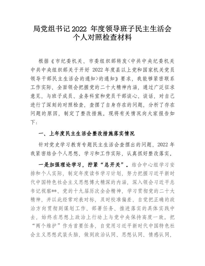 局党组书记2022年度领导班子民主生活会个人对照检查材料根据《市纪委机关、市委组织部转发〈中共中央纪委机关中共中央组织部关于开好2022年度县以上党和国家机关党员领导干部民主生活会的通知>的通知》要求,我能够紧密联系工作实际,全面领会把握党的二十大精神内涵,通过广泛征求意见,与班子成员、业务科室和党员干部谈心、谈话,对自已进行了深刻的对照检查,查摆了自身存在的问题,分析了存在问题的原因,制定了整改措施。现将有关情况向大家报告如下:一、上年度民主生活会整改措施落实情况针对党史学习教育专题民主生活会查摆出的问题,2022年我紧密结合个人思想、学习和工作实际,认真抓好整改落实。一是加强理论学习,拧紧“总开关”。结合中心组学习安排和个人实际,制定年度读书学习计划,努力把握习近平新时代中国特色社会主义思想博大精深的内涵,深入领会习近平总书记视察*、党的十九届历次全会精神,学习贯彻党的二十大精神,并以此经常对表对标,及时校准偏差,自觉把正确的政治方向贯彻到谋划工作、部署任务、推进落实的具体实践中去,始终在思想上政治上行动上与党中央保持高度一致。把“两个维护”作为首要任务,自觉用习近平新时代中国特色社会主义思想武装头脑,做到政治认同、思想认同、情感认同,