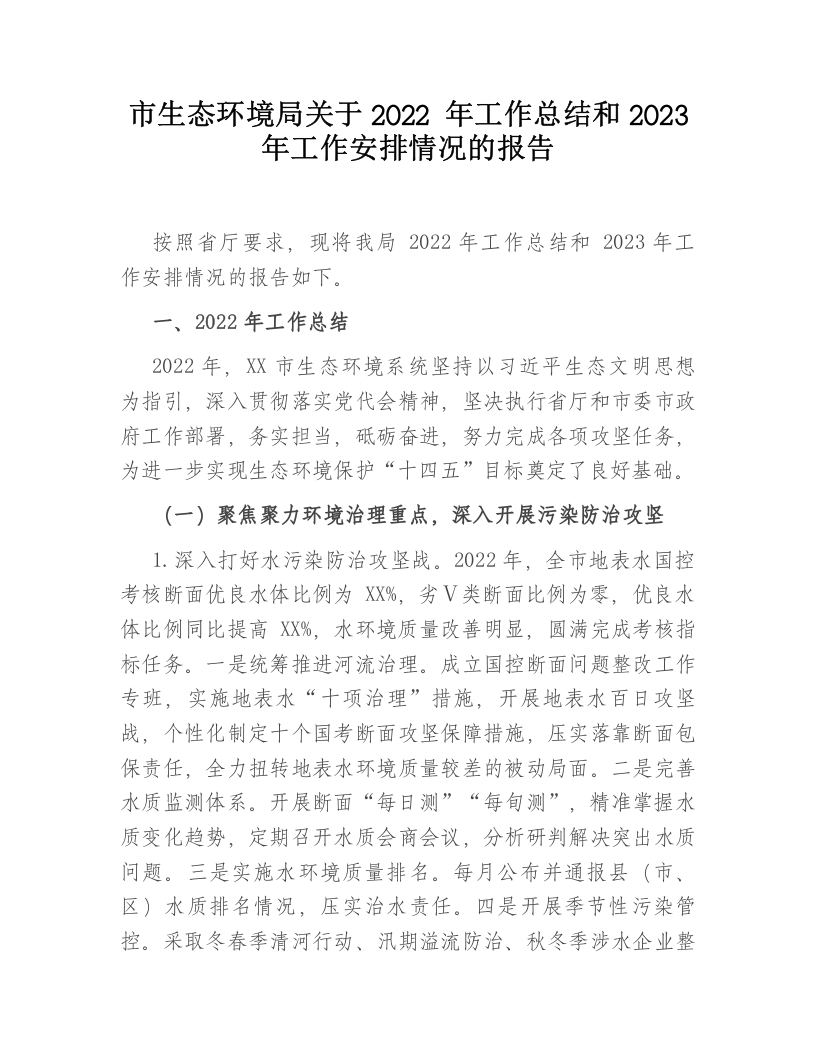 市生态环境局关于2022年工作总结和2023年工作安排情况的报告按照省厅要求,现将我局2022年工作总结和2023年工作安排情况的报告如下。一、2022年工作总结2022年,XX市生态环境系统坚持以习近平生态文明思想为指引,深入贯彻落实党代会精神,坚决执行省厅和市委市政府工作部署,务实担当,砥砺奋进,努力完成各项攻坚任务,为进一步实现生态环境保护“十四五”目标奠定了良好基础。(一)聚焦聚力环境治理重点,深入开展污染防治攻坚1.深入打好水污染防治攻坚战。2022年,全市地表水国控考核断面优良水体比例为XX%,劣V类断面比例为零,优良水体比例同比提高XX%,水环境质量改善明显,圆满完成考核指标任务。一是统筹推进河流治理。成立国控断面问题整改工作专班,实施地表水“十项治理”措施,开展地表水百日攻坚战,个性化制定十个国考断面攻坚保障措施,压实落靠断面包保责任,全力扭转地表水环境质量较差的被动局面。二是完善水质监测体系。开展断面“每日测”“每旬测”,精准掌握水质变化趋势,定期召开水质会商会议,分析研判解决突出水质问题。三是实施水环境质量排名。每月公布并通报县(市、区)水质排名情况,压实治水责任。四是开展季节性污染管控。采取冬春季清河行动、汛期溢流防治、秋冬季涉水企业整
