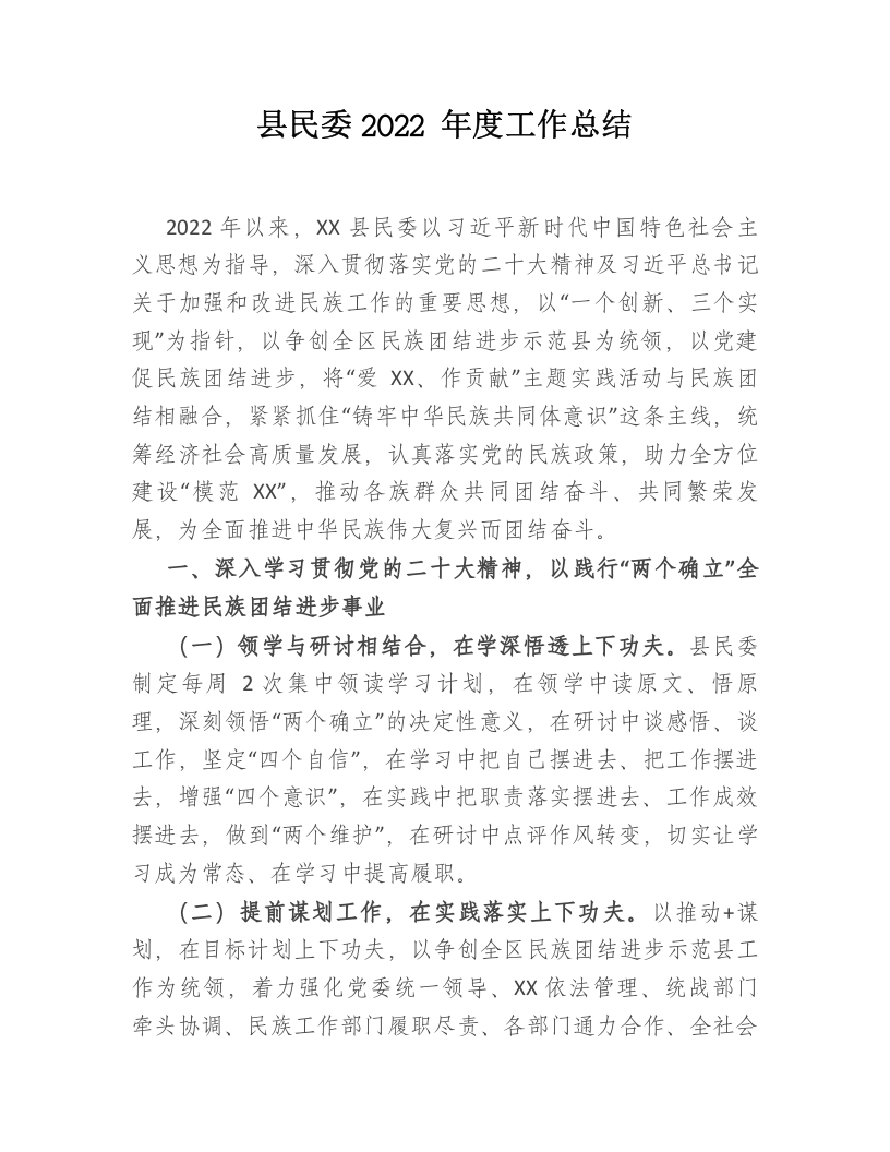 县民委2022年度工作总结2022年以来,X县民委以习近平新时代中国特色社会主义思想为指导,深入贯彻落实党的二十大精神及习近平总书记关于加强和改进民族工作的重要思想,以“一个创新、三个实现”为指针,以争创全区民族团结进步示范县为统领,以党建促民族团结进步,将“爱X、作贡献”主题实践活动与民族团结相融合,紧紧抓住“铸牢中华民族共同体意识”这条主线,统筹经济社会高质量发展,认真落实党的民族政策,助力全方位建设“模范X”,推动各族群众共同团结奋斗、共同繁荣发展,为全面推进中华民族伟大复兴而团结奋斗。一、深入学习贯彻党的二十大精神,以践行“两个确立”全面推进民族团结进步事业(一)领学与研讨相结合,在学深悟透上下功夫。县民委制定每周2次集中领读学习计划,在领学中读原文、悟原理,深刻领悟“两个确立”的决定性意义,在研讨中谈感悟、谈工作,坚定“四个自信”,在学习中把自己摆进去、把工作摆进去,增强“四个意识”,在实践中把职责落实摆进去、工作成效摆进去,做到“两个维护”,在研讨中点评作风转变,切实让学习成为常态、在学习中提高履职。(二)提前谋划工作,在实践落实上下功夫。以推动+谋划,在目标计划上下功夫,以争创全区民族团结进步示范县工作为统领,着力强化党委统一领导、X依法管理、统战部门牵头协调、民族工作部门履职尽责、各部门通力合作、全社会