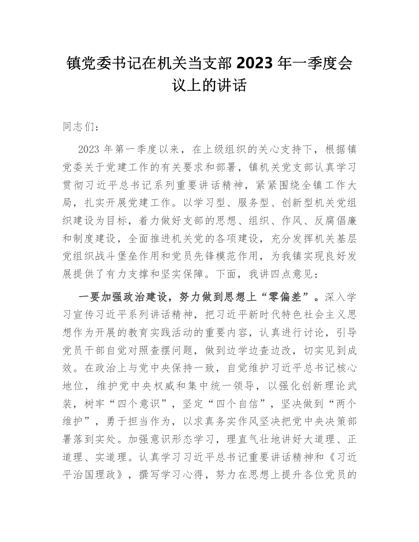 镇党委书记在机关当支部2023年一季度会议上的讲话同志们:2023年第一季度以来,在上级组织的关心支持下,根据镇党委关于党建工作的有关要求和部署,镇机关党支部认真学习贯彻习近平总书记系列重要讲话精神,紧紧围绕全镇工作大局,扎实开展党建工作。以学习型、服务型、创新型机关党组织建设为目标,着力做好支部的思想、组织、作风、反腐倡廉和制度建设,全面推进机关党的各项建设,充分发挥机关基层党组织战斗堡垒作用和党员先锋模范作用,为我镇实现良好发展提供了有力支撑和坚实保障。下面,我讲四点意见:一要加强政治建设,努力做到思想上“零偏差”。深入学习宣传习近平系列讲话精神,把习近平新时代特色社会主义思想作为开展的教育实践活动的重要内容,认真进行讨论,引导党员干部自觉对照查摆问题,做到边学边查边改,切实见到成效。在政治上与党中央保持一致,自觉维护习近平总书记核心地位,维护党中央权威和集中统一领导,以强化创新理论武装,树牢“四个意识”,坚定“四个自信”,坚决做到“两个维护”,勇于担当作为,以求真务实作风坚决把党中央决策部署落到实处。加强意识形态学习,理直气壮地讲好大道理、正道理、实道理。认真学习习近平总书记重要讲话精神和《习近平治国理政》,撰写学习心得,努力在思想上提升各位党员的
