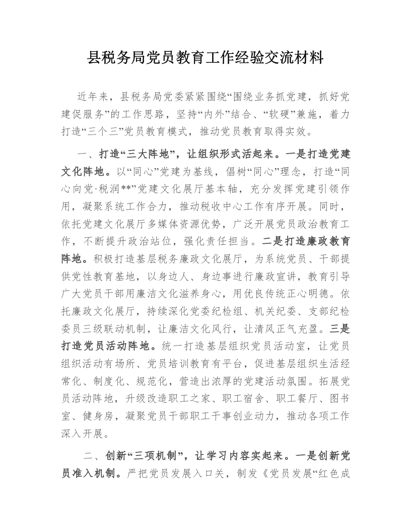 县税务局党员教育工作经验交流材料近年来,县税务局党委紧紧围绕“围绕业务抓党建,抓好党建促服务”的工作思路,坚持“内外”结合、“软硬”兼施,着力打造“三个三”党员教育模式,推动党员教育取得实效。一、打造“三大阵地”,让组织形式活起来。一是打造党建文化阵地。以“同心”党建为基线,倡树“同心”理念,打造“同心向党·税润*”党建文化展厅基本轴,充分发挥党建引领作用,凝聚系统工作合力,推动税收中心工作有序开展。同时,依托党建文化展厅多媒体资源优势,广泛开展党员政治教育工作,不断提升政治站位,强化责任担当。二是打造廉政教育阵地。积极打造基层税务廉政文化展厅,为系统党员、干部提供党性教育基地,以身边人、身边事进行廉政宣讲,教育引导广大党员干部用廉洁文化滋养身心,用优良传统正心明德。依托廉政文化展厅,持续深化党委纪检组、机关纪委、支部纪检委员三级联动机制,让廉洁文化风行,让清风正气充盈。三是打造党员活动阵地。统一打造基层组织党员活动室,让党员组织活动有场所、党员培训教育有平台,促进基层组织生活经常化、制度化、规范化,营造出浓厚的党建活动氛围。拓展党员活动阵地,升级改造职工之家、职工宿舍、职工餐厅、图书室、健身房,凝聚党员干部职工干事创业动力,推动各项工作深入开展。二、创新“三项机制”,让学习内容实起来。一是创新党员准入机制。严把党员发展入口关,制发《党员发展“红色成