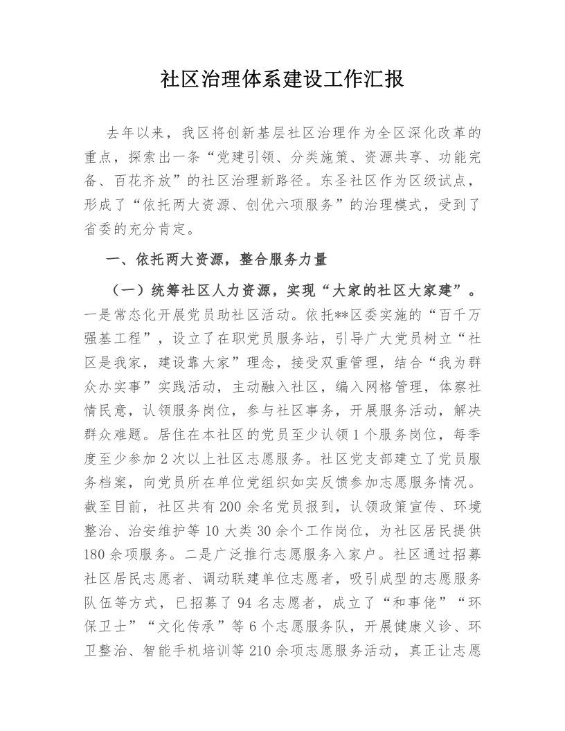 社区治理体系建设工作汇报去年以来,我区将创新基层社区治理作为全区深化改革的重点,探索出一条“党建引领、分类施策、资源共享、功能完备、百花齐放”的社区治理新路径。东圣社区作为区级试点,形成了“依托两大资源、创优六项服务”的治理模式,受到了省委的充分肯定。一、依托两大资源,整合服务力量(一)统筹社区人力资源,实现“大家的社区大家建”。一是常态化开展党员助社区活动。依托*区委实施的“百千万强基工程”,设立了在职党员服务站,引导广大党员树立“社区是我家,建设靠大家”理念,接受双重管理,结合“我为群众办实事”实践活动,主动融入社区,编入网格管理,体察社情民意,认领服务岗位,参与社区事务,开展服务活动,解决群众难题。居住在本社区的党员至少认领1个服务岗位,每季度至少参加2次以上社区志愿服务。社区党支部建立了党员服务档案,向党员所在单位党组织如实反馈参加志愿服务情况。截至目前,社区共有200余名党员报到,认领政策宣传、环境整治、治安维护等10大类30余个工作岗位,为社区居民提供180余项服务。二是广泛推行志愿服务入家户。社区通过招募社区居民志愿者、调动联建单位志愿者,吸引成型的志愿服务队伍等方式,已招募了94名志愿者,成立了“和事佬”“环保卫士”“文化传承”等6个志愿服务队,开展健康义诊、环卫整治、智能手机培训等210余项志愿服务活动,真正让志愿