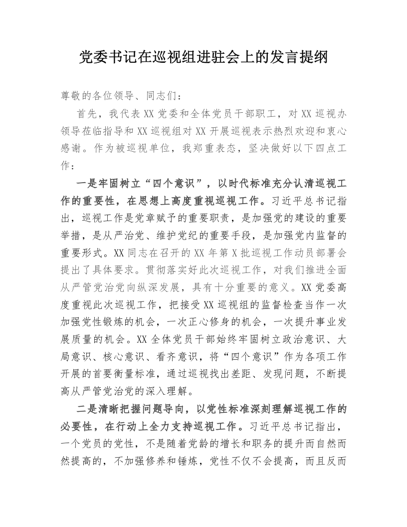 党委书记在巡视组进驻会上的发言提纲尊敬的各位领导、同志们:首先,我代表XX党委和全体党员干部职工,对XX巡视办领导莅临指导和X巡视组对XX开展巡视表示热烈欢迎和衷心感谢。作为被巡视单位,我郑重表态,坚决做好以下四点工作:一是牢固树立“四个意识”,以时代标准充分认清巡视工作的重要性,在思想上高度重视巡视工作。习近平总书记指出,巡视工作是党章赋予的重要职责,是加强党的建设的重要举措,是从严治党、维护党纪的重要手段,是加强党内监督的重要形式。XX同志在召开的XX年第X批巡视工作动员部署会提出了具体要求。贯彻落实好此次巡视工作,对我们推进全面从严管党治党向纵深发展,具有十分重要的意义。XX党委高度重视此次巡视工作,把接受XX巡视组的监督检查当作一次加强党性锻炼的机会,一次正心修身的机会,一次提升事业发展质量的机会。XX全体党员干部始终牢固树立政治意识、大局意识、核心意识、看齐意识,将“四个意识”作为各项工作开展的首要衡量标准,通过巡视找出差距、发现问题,不断提高从严管党治党的深入理解。二是清晰把握问题导向,以党性标准深刻理解巡视工作的必要性,在行动上全力支持巡视工作。习近平总书记指出,一个党员的党性,不是随着党龄的增长和职务的提升而自然而然提高的,不加强修养和锤炼,党性不仅不会提高,而且反而