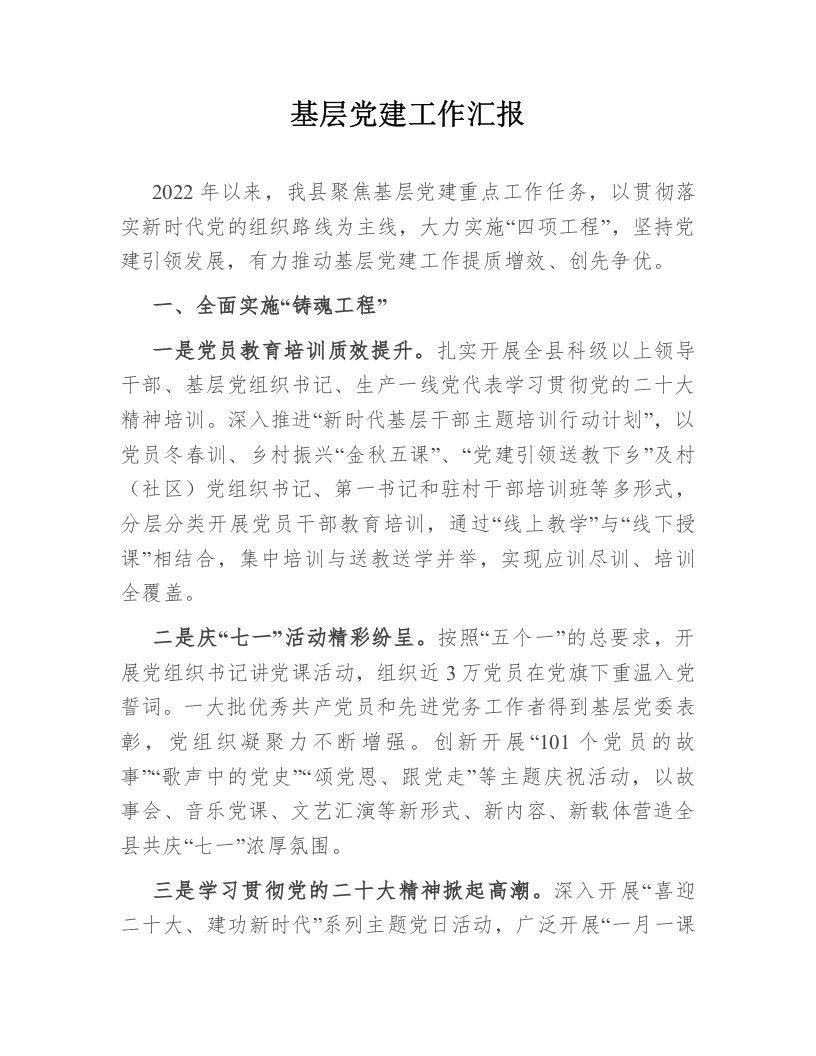 基层党建工作汇报2022年以来,我县聚焦基层党建重点工作任务,以贯彻落实新时代党的组织路线为主线,大力实施“四项工程”,坚持党建引领发展,有力推动基层党建工作提质增效、创先争优。一、全面实施“铸魂工程”一是党员教育培训质效提升。扎实开展全县科级以上领导干部、基层党组织书记、生产一线党代表学习贯彻党的二十大精神培训。深入推进“新时代基层干部主题培训行动计划”,以党员冬春训、乡村振兴“金秋五课”、“党建引领送教下乡”及村(社区)党组织书记、第一书记和驻村干部培训班等多形式,分层分类开展党员干部教育培训,通过“线上教学”与“线下授课”相结合,集中培训与送教送学并举,实现应训尽训、培训全覆盖。二是庆“七一”活动精彩纷呈。按照“五个一”的总要求,开展党组织书记讲党课活动,组织近3万党员在党旗下重温入党誓词。一大批优秀共产党员和先进党务工作者得到基层党委表彰,党组织凝聚力不断增强。创新开展“101个党员的故事“歌声中的党史“颂党恩、跟党走”等主题庆祝活动,以故事会、音乐党课、文艺汇演等新形式、新内容、新载体营造全县共庆“七一”浓厚氛围。三是学习贯彻党的二十大精神掀起高潮。深入开展“喜迎二十大、建功新时代”系列主题党日活动,广泛开展“一月一课