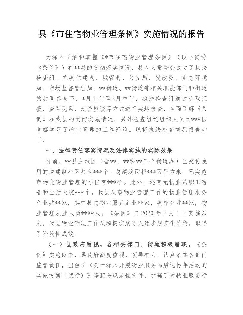 县《市住宅物业管理条例》实施情况的报告为深入了解和掌握《*市住宅物业管理条例》(以下简称《条例》)在*县的贯彻落实情况,县人大常委会成立了执法检查组,在县住建局、城管局、公安局、发改委、生态环境局、市场监督管理局、**街道、*街道等相关职能部门和街道的共同参与下,*月上旬至*月中旬,执法检查组通过听取汇报、查看现场、走访座谈等方式进行实地检查,全面了解《条例》在我县的贯彻实施情况,另外检查组还组织人员到***区考察学习了物业管理的工作经验。现将执法检查情况报告如下:一、法律责任落实情况及法律实施的实际效果目前,*县主城区(含*、**和*三个街道办)已交付使用的成建制小区共有**个,总建筑面积**万平方米,已实施市场化物业管理的小区有**个。此外,还有无物业的职工宿舍和生活大院*个。我县从事物业管理工作的物业管理服务企业共*家,其中县内物业服务企业*家,县外企业*家,物业管理从业人员**人。《条例》自2020年3月1日实施以来,我县物业管理工作从积极实践进入逐步规范化阶段,取得了阶段性成效。(一)县政府重视,各相关部门、街道积极履职。《条例》实施以来,县政府高度重视,领导有力,认真落实各部门监管责任,出台了《关于深入开展物业服务品质达标年活动的实施方案(试行)》等配套规范性文件,加强了对物业服务行