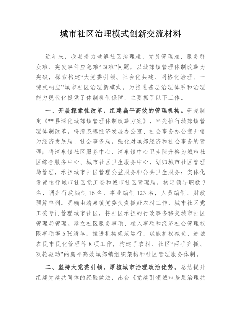 城市社区治理模式创新交流材料近年来,我县着力破解社区治理难、党员管理难、服务群众难、突发事件应急难“四难”问题,以城郊镇管理体制改革为突破,探索构建“大党委引领、社会化共建、网格化治理、一键式响应”城市社区治理新模式,为推进基层治理体系和治理能力现代化提供了体制机制保障。主要抓了以下工作。一、开展探索性改革,组建扁平高效的管理机构。研究制定《*县深化城郊镇管理体制改革方案》,率先推行城郊镇管理体制改革,将清泉镇经济发展办公室、社会事务办公室升格为经济发展局、社会事务局,强化对城郊经济和社会事务的管理;将清泉镇社区服务中心、清泉镇中心卫生院升格为城市社区综合服务中心、城市社区卫生服务中心,划归城市社区管理局管理,承担城市社区管理公益服务和公共卫生服务;实体化设置运行城市社区党工委和城市社区管理局,核定领导职数7名,调剂行政编制16名、事业编制123名,人员编制、财政预算单列。明确由清泉镇党委负责抓好农村工作,城市社区党工委专门管理城市社区,将社区承担的行政事务移交城市社区管理局管理。建立社区服务事项、准入事项和经济社会管理权限事项等5张清单,推进机构规范运行、赋能扩权减负、进城农民市民化管理等8项工作,构建了农村、社区“两手齐抓、双轮驱动”的扁平高效城郊镇组织架构和社区管理服务体制。二、坚持大党委引领,厚植城市治理政治优势。总结提升组建党建共同体的经验做法,出台《党建引领城市基层治理共