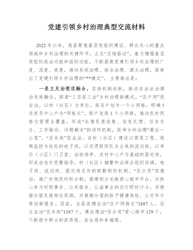 党建引领乡村治理典型交流材料2022年以来,我县聚焦基层党组织建设、群众关心的重点领域和乡村治理的关键环节,立足“五维驱动”,着力增强基层党组织政治功能和组织功能,不断提高党建引领乡村治理的广度、深度、效度,推动系统治理、综合治理、源头治理,探索出了党建引领乡村治理的“*模式”。主要做法是:一是立足治理促融合。坚持机制创新,推动自治法治德治有效融合,探索“三百促三治”乡村治理新模式。“百户网”促自治。以村(社区)为单位,每百户划为一个小网格,明确1名党员中心户为“网格长”,联户包保1个小网格,推动农村网格化管理全覆盖,形成“社情民意收集、信息反馈、任务交办、工作推动、问题解决”的闭环机制,延伸乡村治理“最后一公里”。“百米岗”促法治。在村(社区)建设以雪亮工程、视频监控为依托的电子岗,以巡逻联防队为主体的流动岗,以单位(小区)门卫室、治安岗亭、农村中心户为基础的固定岗,形成由包片民警指导,村(社区)辅警和治保会组织协调,电子岗、流动岗、固定岗互补的联勤联防机制。“百分奖”促德治。推广村规民约积分制,搭建积分兑换爱心超市平台,对热心参与村级事务、公共服务、公益事业的实行即时计分,并根据分值兑换相应奖励,对高额分值的给予健康体检、公交年卡等创新服务。目前,全县选聘自治“百户网格长”1887人,设立法治“百米岗”1387个,建成德治“百分奖”爱心超市129个,不断提升群众的获得感、安全感和幸福感。