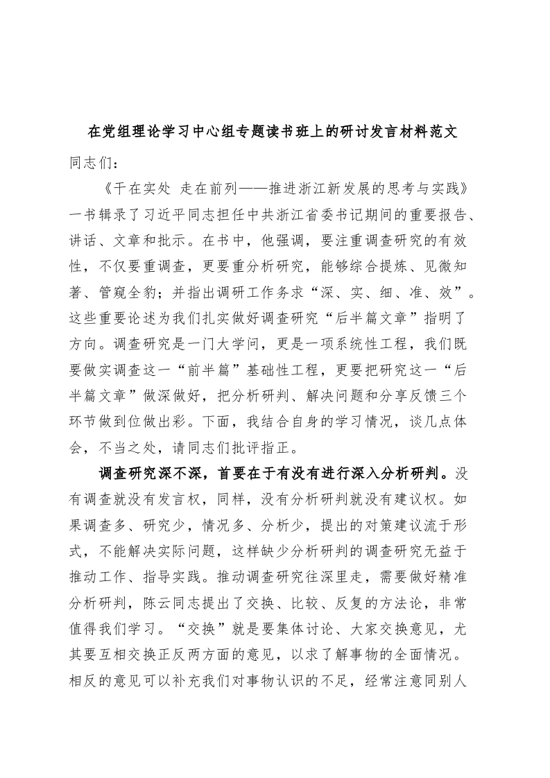 在党组理论学习中心组专题读书班上的研讨发言材料范文同志们:《干在实处走在前列一一推进浙江新发展的思考与实践》一书辑录了习近平同志担任中共浙江省委书记期间的重要报告、讲话、文章和批示。在书中,他强调,要注重调查研究的有效性,不仅要重调查,更要重分析研究,能够综合提炼、见微知著、管窥全豹;并指出调研工作务求“深、实、细、准、效”。这些重要论述为我们扎实做好调查研究“后半篇文章”指明了方向。调查研究是一门大学问,更是一项系统性工程,我们既要做实调查这一“前半篇”基础性工程,更要把研究这一“后半篇文章”做深做好,把分析研判、解决问题和分享反馈三个环节做到位做出彩。下面,我结合自身的学习情况,谈几点体会,不当之处,请同志们批评指正。调查研究深不深,首要在于有没有进行深入分析研判。没有调查就没有发言权,同样,没有分析研判就没有建议权。如果调查多、研究少,情况多、分析少,提出的对策建议流于形式,不能解决实际问题,这样缺少分析研判的调查研究无益于推动工作、指导实践。推动调查研究往深里走,需要做好精准分析研判,陈云同志提出了交换、比较、反复的方法论,非常值得我们学习。“交换”就是要集体讨论、大家交换意见,尤其要互相交换正反两方面的意见,以求了解事物的全面情况。相反的意见可以补充我们对事物认识的不足,经常注意同别人